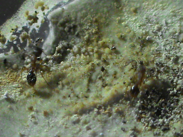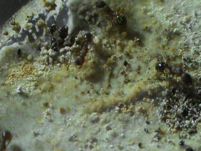 Bene bene le operaie sono attive da un paio di settimane e quindi le ho messe in una nuova arena pulita e con antifuga nuovo ed ho ricominciato a fornire proteine, subito gradite ed assaltate in massa.