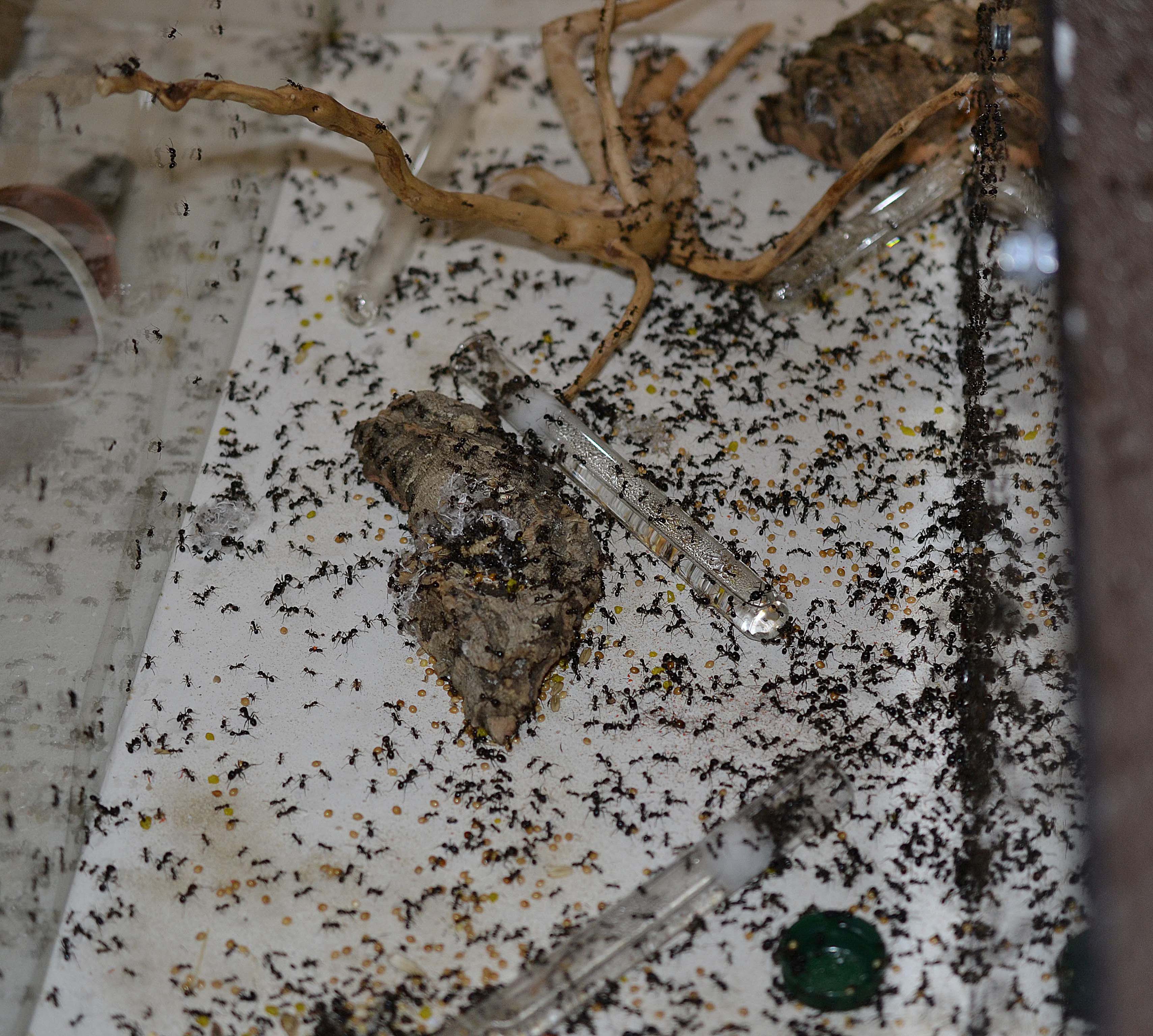 Ho subito iniziato a somministrare quantità più sostenute di cibo e fra qualche giorno dovrò iniziare a pulire la teca in quanto la quantità di scarti ed operaie morte è stata notevole, nonostante durante le operazioni manuali non ho riscontrato difficoltà particolari nel recuperare le operaie restie allo spostamento. Sembrava quasi che molte operaie si 'spegnessero' dopo eccessivi e costanti sforzi