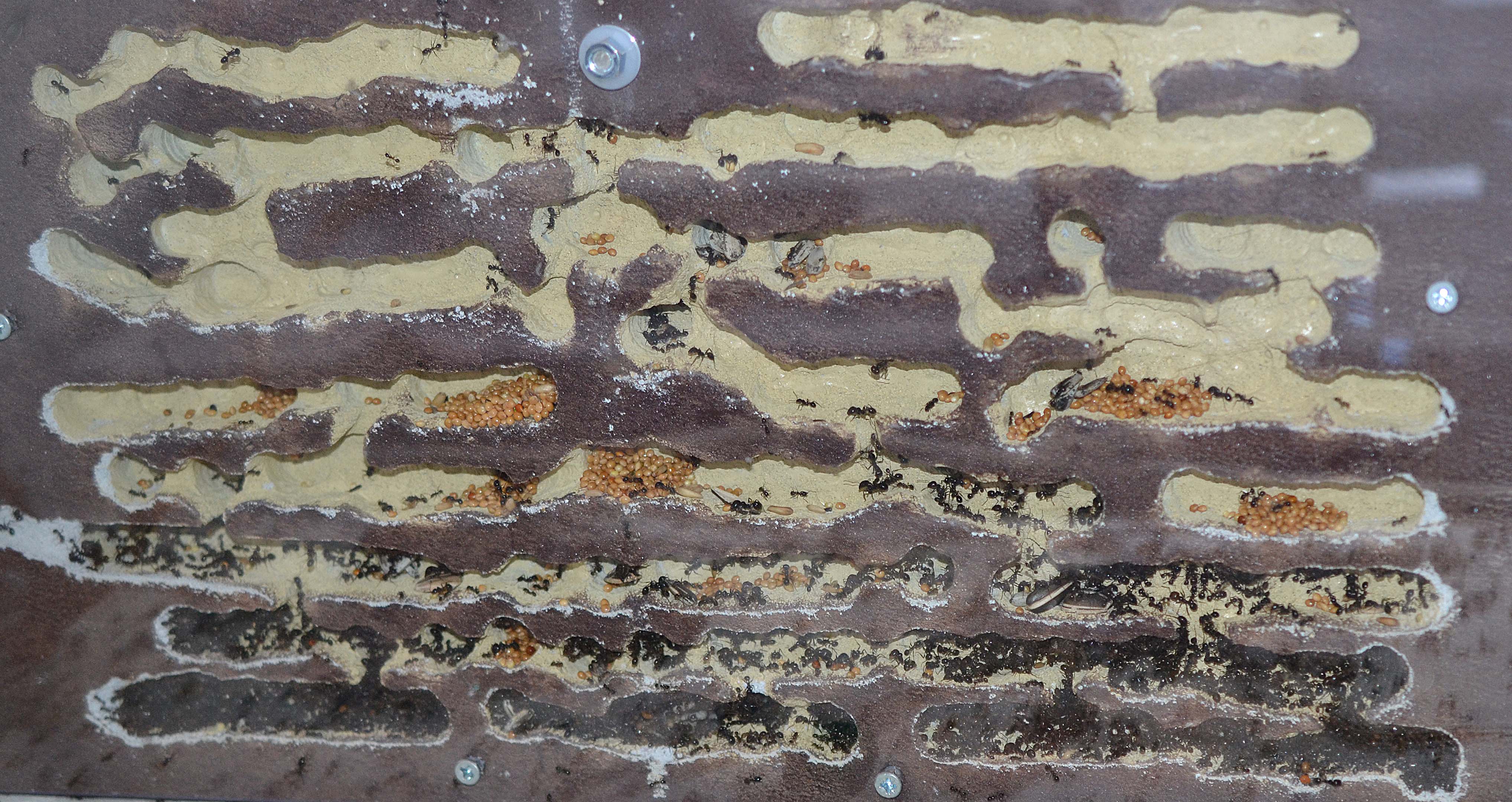 Anche lo scavo principale ha subito un notevole progresso portando alucne operaie a raggiungere il retro del nido (che sebbene in parte sigillato, ha permesso proprio oggi la fuoriuscita di un paio di minor). Ho quindi provveduto a proseguire l'applicazione di plexiglass lasciando libera solo la parte superiore del formicaio.