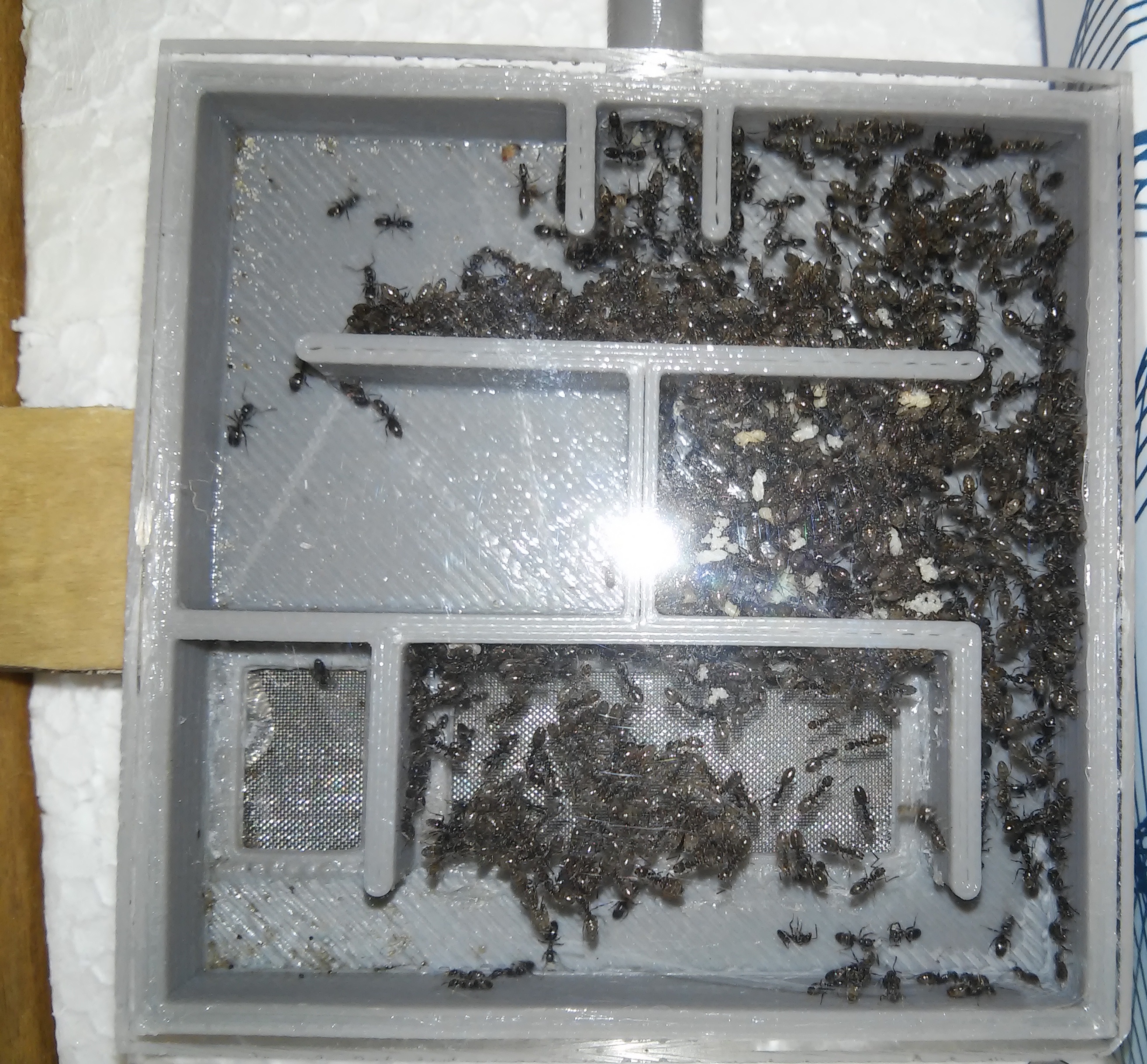 Il nido è di dimensioni 7x7 cm ed ha una vasca d'idratazione al di sotto di tutta la struttura, con l'umidità che si diffonde attraverso la rete da 0,1 mm. Il plexiglas è incollato al nido.