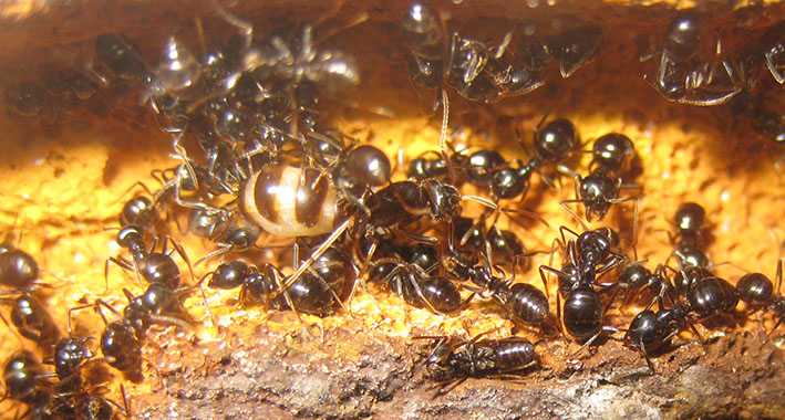 Due Giornate con Api e Formiche a Milano. In questa occasione, oberato da troppe colonie da accudire, yuri mi passa la sua colonia, in un nido in gasbeton 25 x15, verticale, faccia singola. È già evidente che prima di fine anno andranno trasferite, perché la covata presente è notevole, e per fortuna che le formiche sono piccole! La prima cosa che salta all’occhio è proprio il perfetto ordine in cui le operaie gestiscono gli stadi di crescita della covata: stanza della regina, delle uova, uova appena schiuse, larve piccole, larve medie, bozzoli… tutto ben separato, ben gestito. Le formiche lucide sono indaffaratissime e sembrano instancabili.