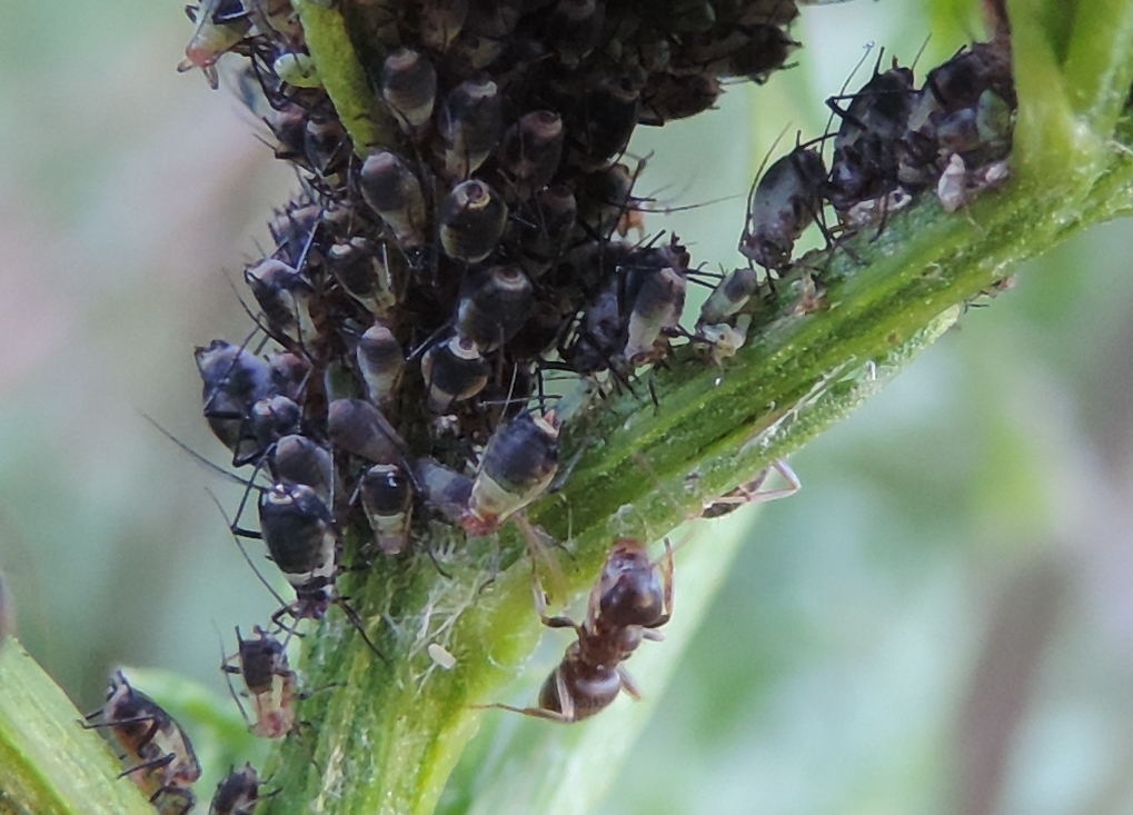 Fotografate in Val di Susa a Salbertrand (TO) il 21 agosto del 2016, a circa 1000 metri di quota, è possibile identificare queste formiche che si stavano occupando di una colonia di afidi? Gli afidi si trovavano su un Tanaceto e appartengono alla specie Metopeurum fuscoviride, che mi dicono dovrebbe essere regolarmente allevata da Lasius niger. Tra l’altro ho l’impressione che ci fossero due specie diverse, perché gli esemplari delle prime due foto sono molto più grossi degli afidi e mi sembrano delle Serviformica mentre quelle delle ultime (purtroppo sfocate) sono decisamente più piccole e potrebbero essere effettivamente delle Lasius…