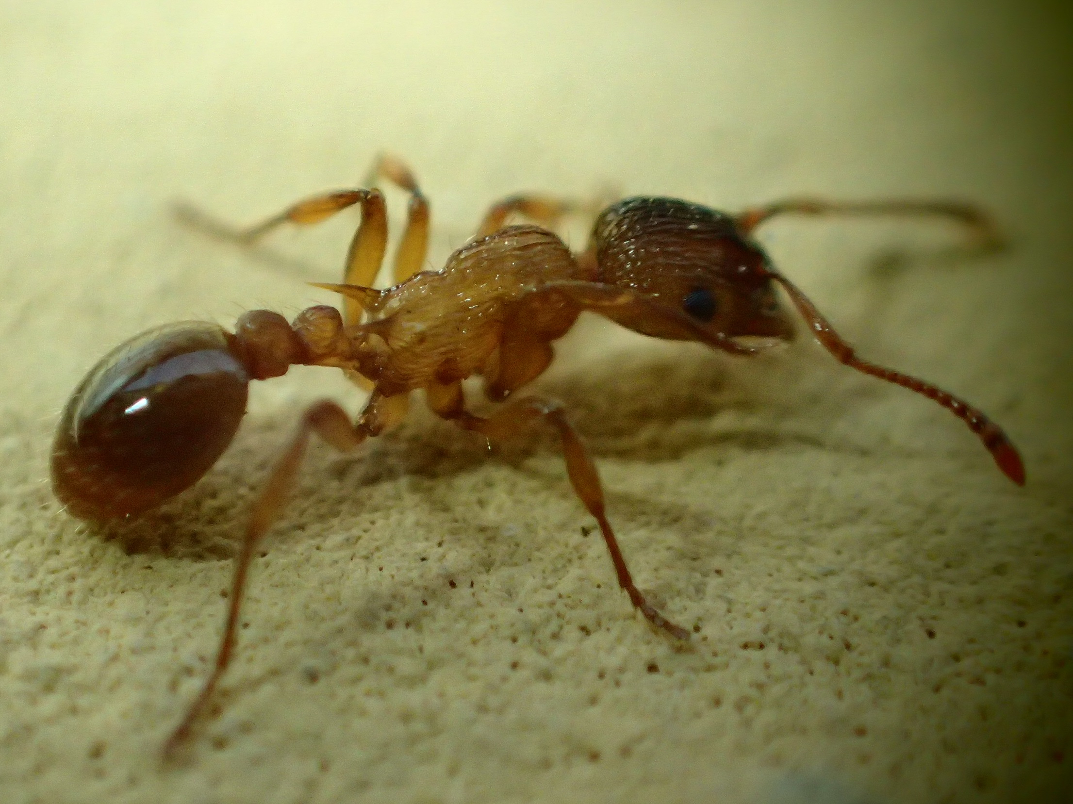 Ieri, Castelleone (CR), sul muro di un edificio rurale. esemplare "solitario" in esplorazione. Dimensioni più cospicue (secondo me, circa 5-6 mm) di quelle delle Myrmica che ho postato recentemente e che si trovavano in un bosco distante circa 500 m dal punto di questa osservazione). Anche il colore, dal vivo, mi sembrava un pochino più chiaro di quello delle altre, classificate come possibili M. rubra.
