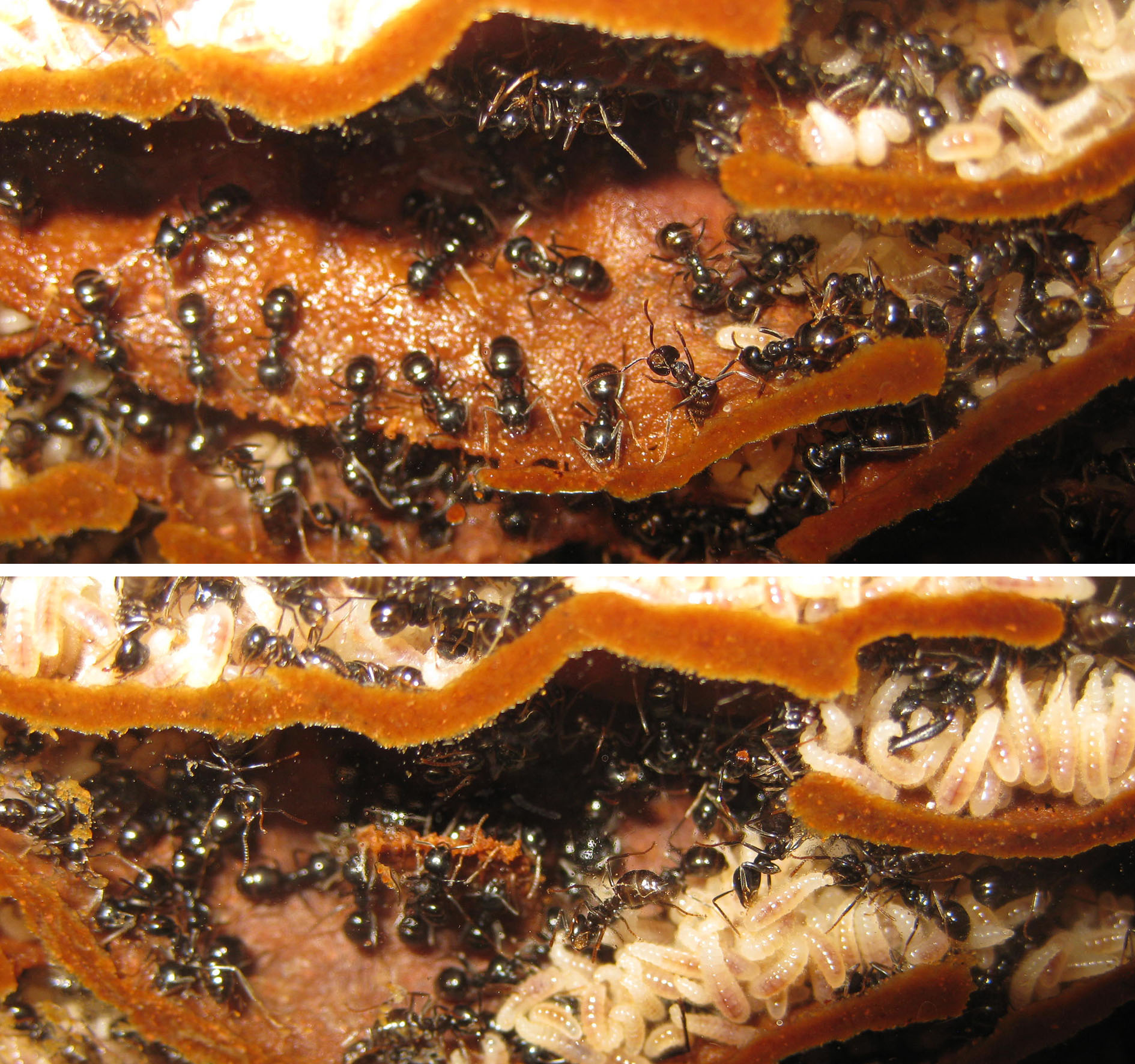 In queste immagini si vede meglio come opera Lasius fuliginosus nella costruzione dei ripiani di cartone masticato. Oltre al trasporto delle schegge di legno lavorato, si può vedere che la maggior parte della cura le formiche la mettono nel "leccare” con la ligula la superficie plasmata. Sembra fondamentale l'apporto di umidità per la lavorazione; si capisce allora perché queste formiche siano così assetate e gradiscano le sostanze zuccherine soprattutto quando sono molto fluide, per operare su così tanto materiale serve non avere la gola secca!