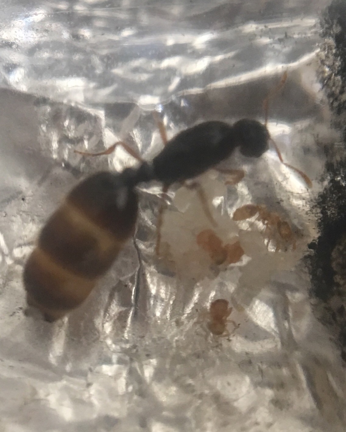 10 minuti fa ho prelevato due regine appena uscite da un formicaio di Solenopsis fugax e in procinto di sciamare, una era già fuori a sciamatura in corso quindi potrebbe già essere stata fecondata e una invece sicuramente no perché L ho vista uscire...poi ho prelevato 4 o 5 maschi da un altro nido sempre qui vicino casa e li ho messi tutti insieme in provetta...bene dopo nemmeno 5 minuti che erano dentro le regine si sono dealate ed hanno cominciato a strofinarsi con la bocca sull’estremità de gastro, tutte e due quasi contemporaneamente tanto che in una frazione di secondo mi sono perso chi era una e chi l’altra!