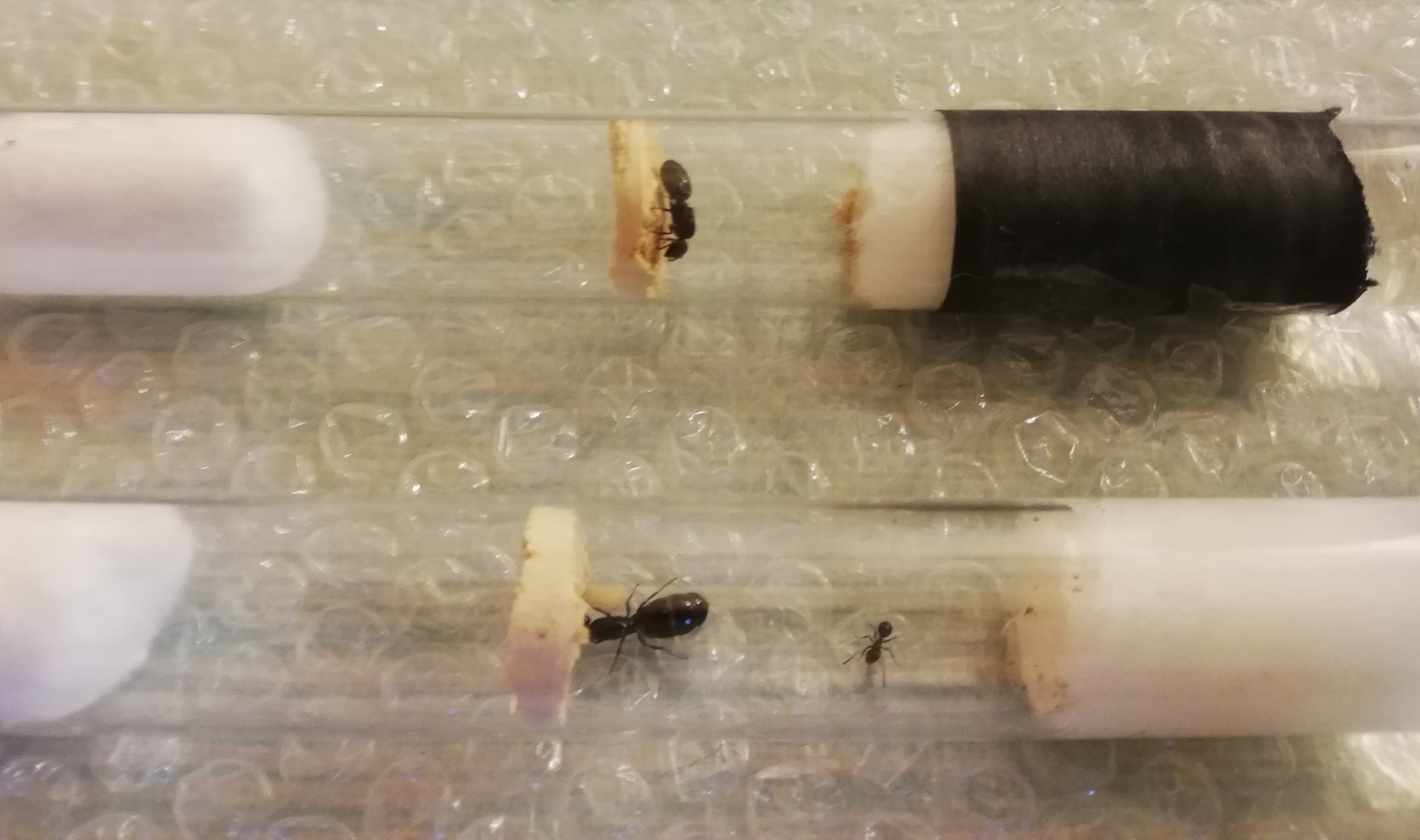 .. Così si tiene il claustro (la zona vicino al cotone che di solito abitano) e "l'arena" in un unica provetta. Al momento sto utilizzando questo set-up sia per la Colonietta di Camponotus lateralis che per la regina di Crematogaster scutellaris trovata ieri. Si nota subito che stanno più vicino al sughero che al cotone umido del serbatoio, e io da ignorante ho pensato che preferissero stare "in verticale" ma non a contatto con il cotone umido. Inoltre la sezione di sughero è sottile e se volessero masticarlo per occultarsi non riuscirebbero. Aspetto di provarlo su specie non arboricole e che non amano il secco, per vedere il comportamento. Grazie e scusate per la lunga spiegazione. METTO LE FOTO QUI SOTTO