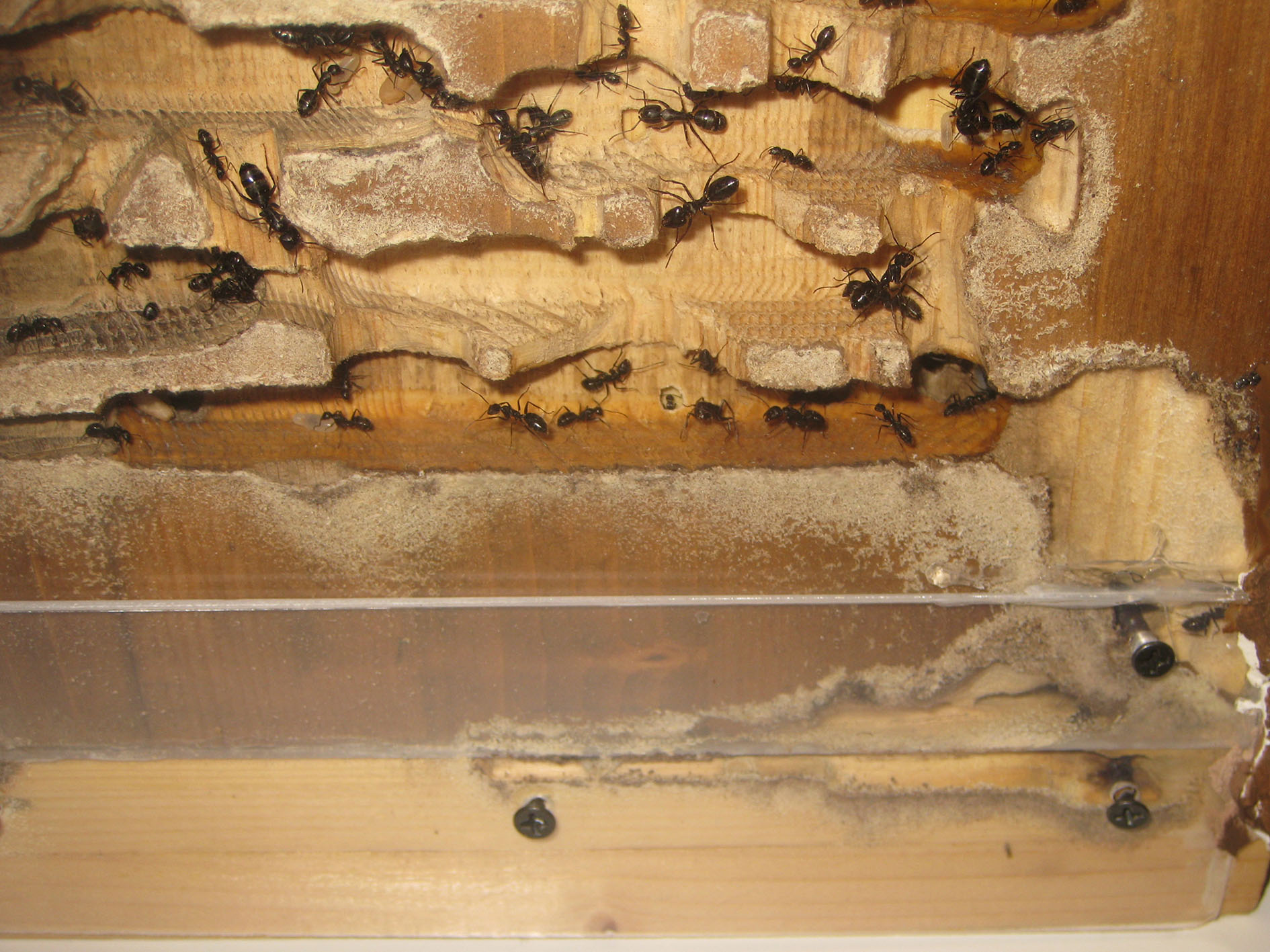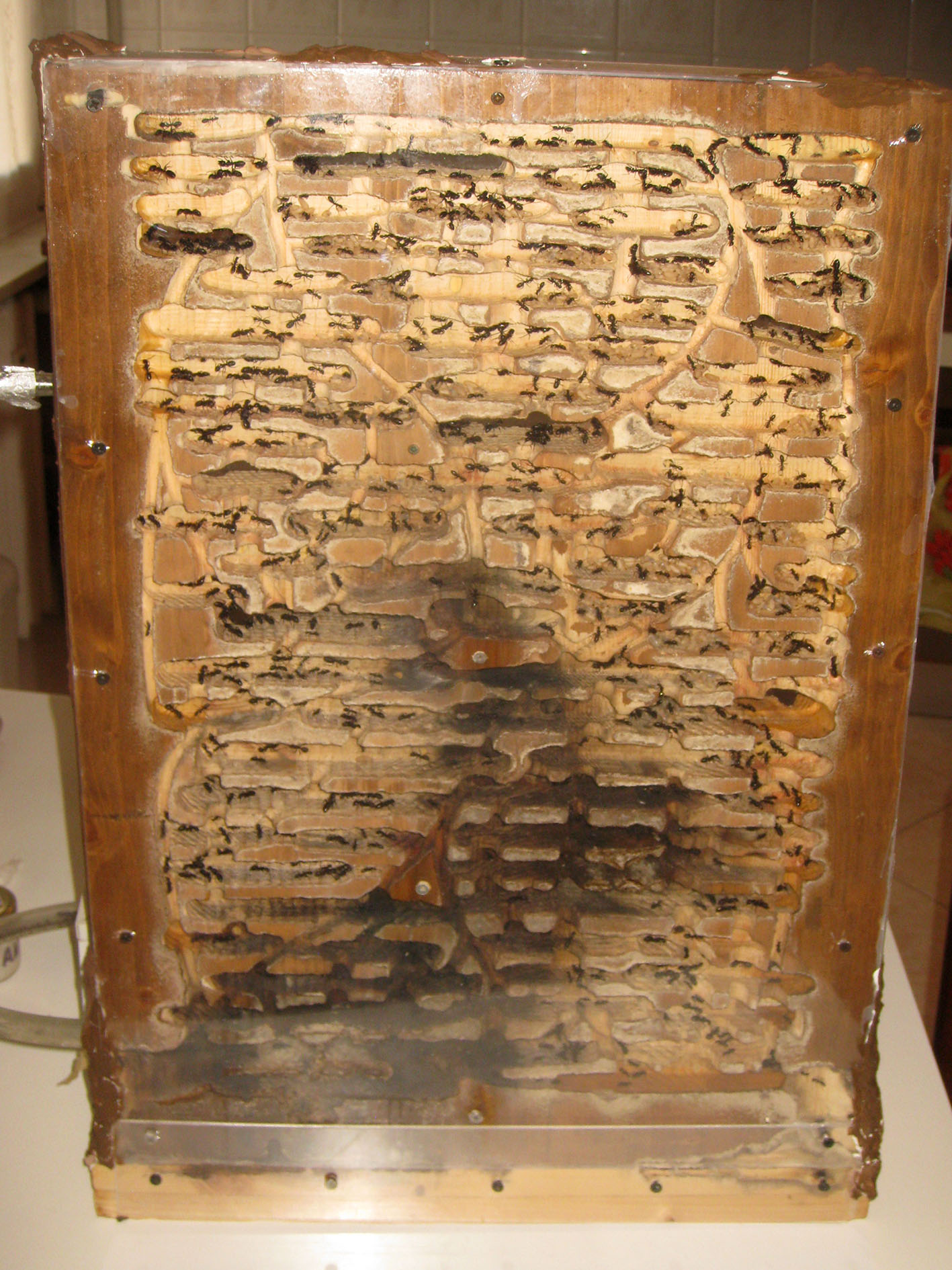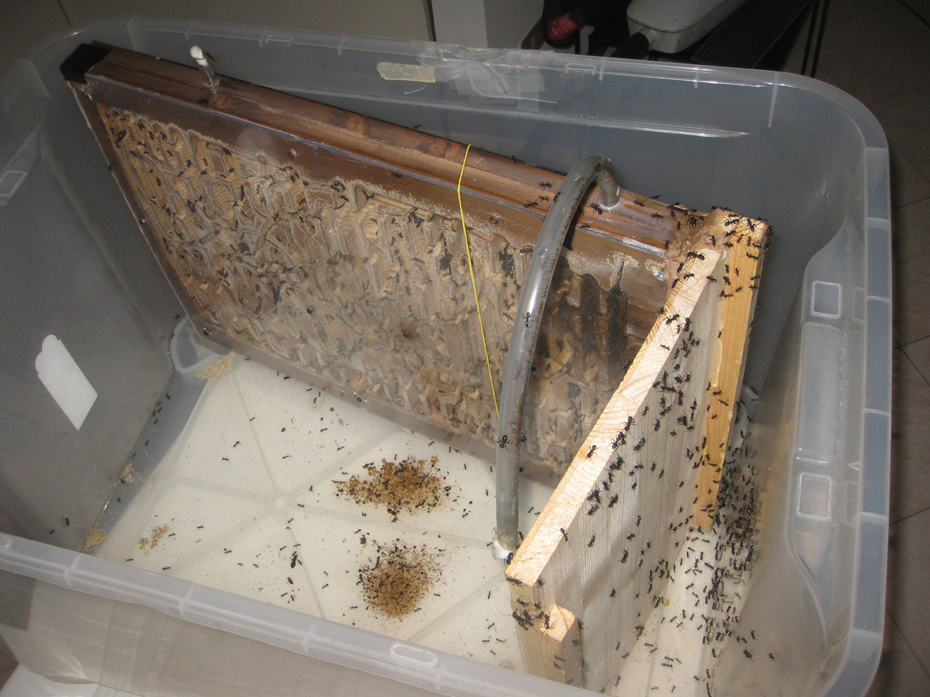 Ci siamo confrontati più volte io e yuri, che ha una colonia uguale e forse più grande della mia (quest'anno la sua ha prodotto un numero imprecisato e infinito di alati di ambo i sessi), e abbia convenuto che l'unico modo per mantenere in casa una colonia di Camponotus vagus adulta è di inserire tutto il nido direttamente in arena.