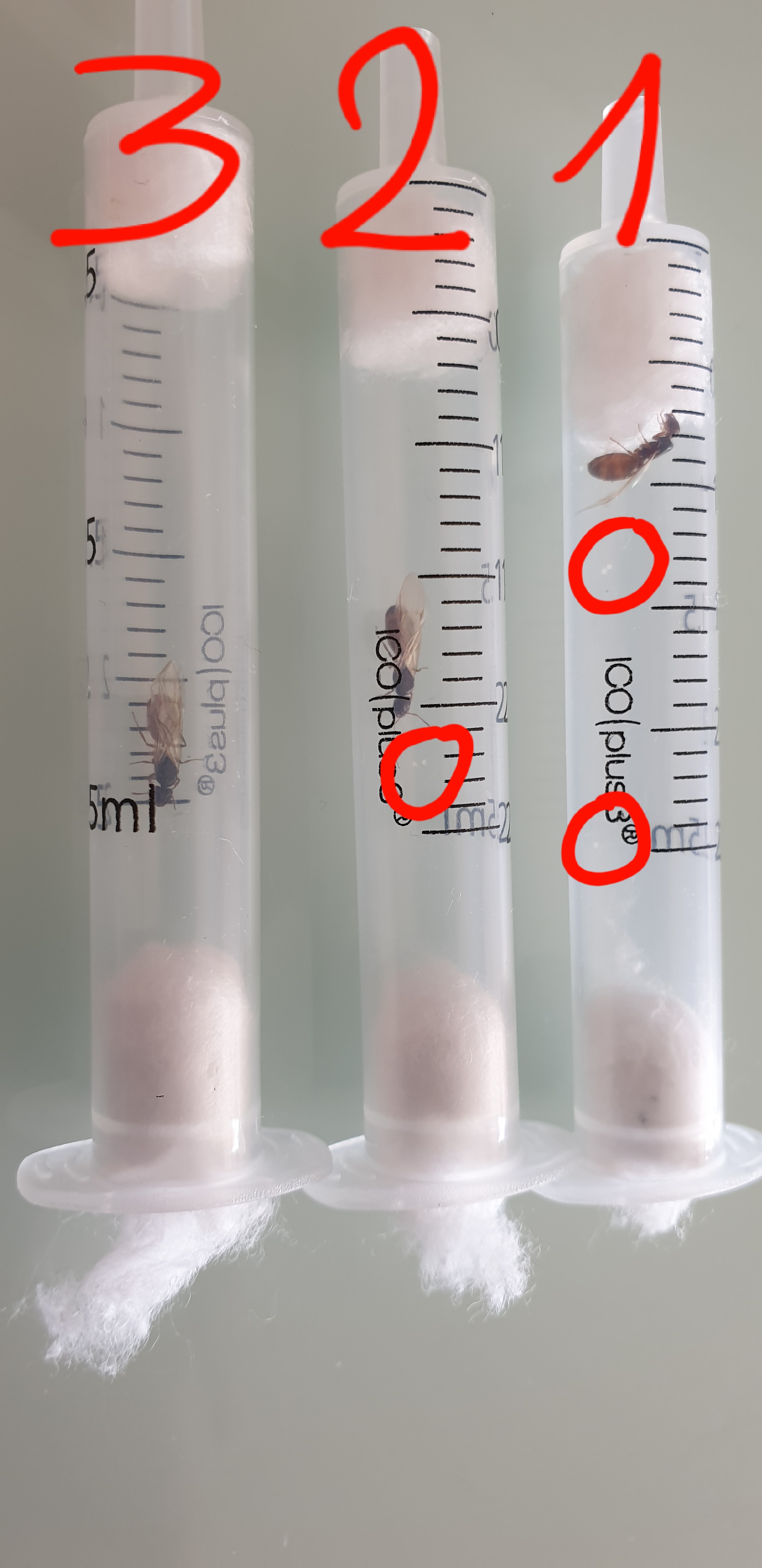 Questa con le siringhe ritengo a mio modesto parere possa essere una soluzione comoda a breve periodo, nell’attesa di alloggiarle nella classica provetta. A lungo periodo rischi che non essendoci il sottovuoto, ogni volta che andrai ad idratare, di allagare l’alloggiamento della regina. Inoltre non essendoci il sottovuoto potresti avere proliferazione di muffe sia dalla parte della regina che da quella del buco a contatto con l’aria. Inoltre per avere un tasso di umidità accettabile per la specie dovresti idratare spessissimo, con conseguente stress per la regina. Comunque avendole prese così vicine al formicaio è facile che siamo state prese prima del volo nuziale...incrociamo le dita!