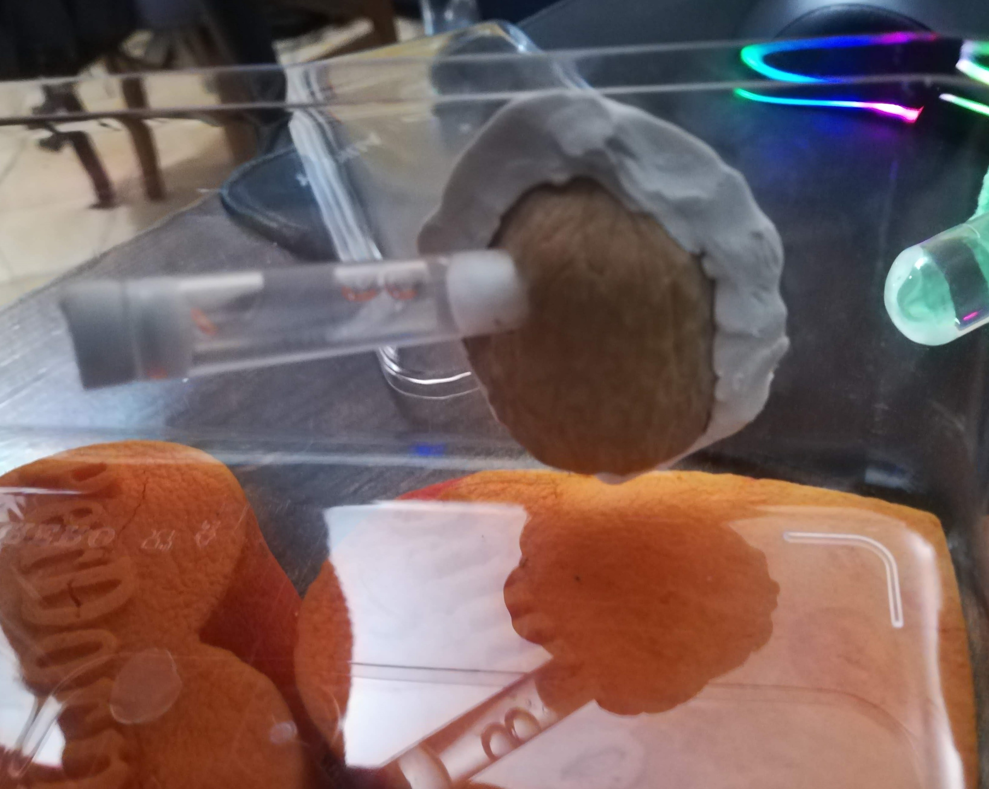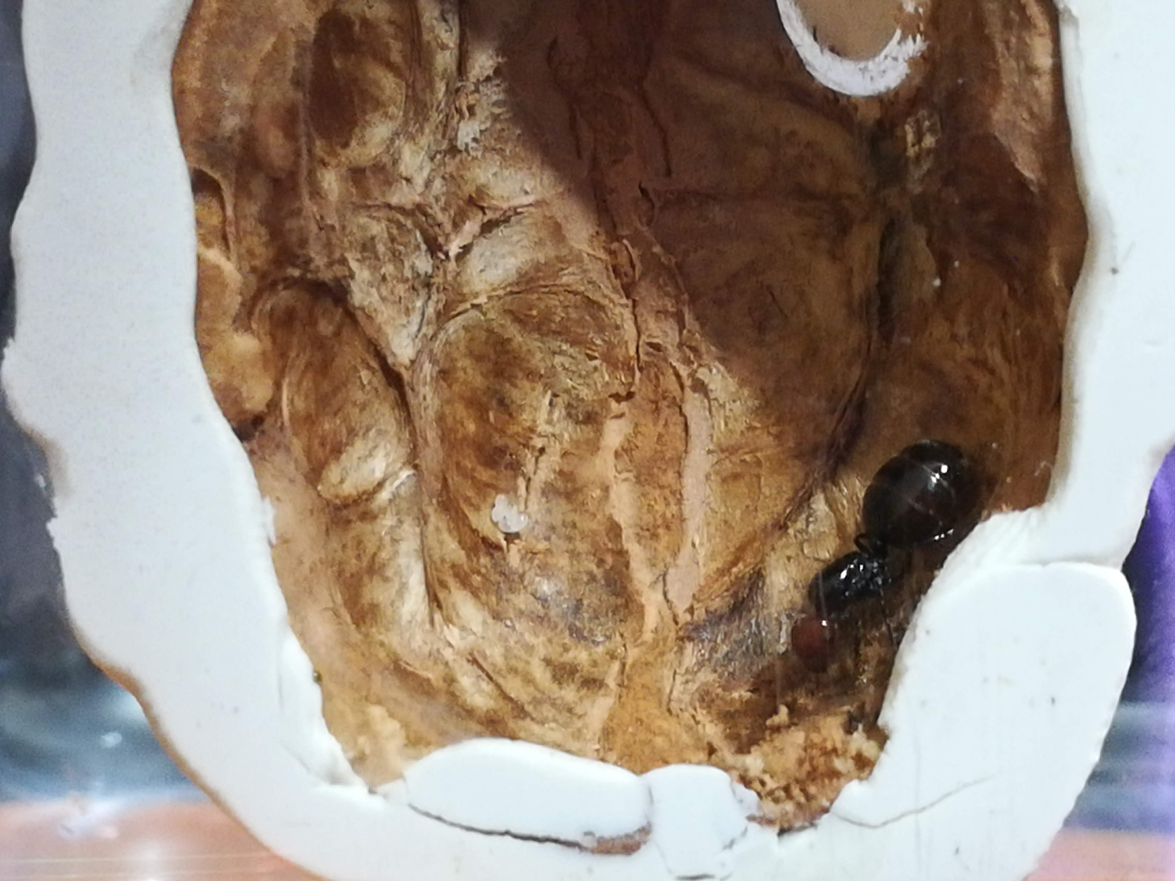 Continua ad essere agitata e preferisce la zona più asciutta, è evidente che nella provetta o nel luogo dove la tengo non si sente a suo agio. Ho deciso di provare a farla fondare in un mezzo guscio di noce, incollato alla parete di una mini arena con del pongo, dovrebbe essere atossico e di facile rimozione in caso di problemi. L’ingresso al claustro è stato fatto con una punta per legno 8 mm ed è tenuto chiuso con un piccola provetta di plastica per l’acqua e l'umidità. Nella noce ho aggiunto 3 granelli di zucchero e un moscerino morto. Gli ho permesso di fare un giro in arena prima che entrasse nella noce, sembra che la noce gli piaccia. Sembrerebbe inoltre che durante l'uscita in arena abbia evitato il pongo, cosa da approfondire.
