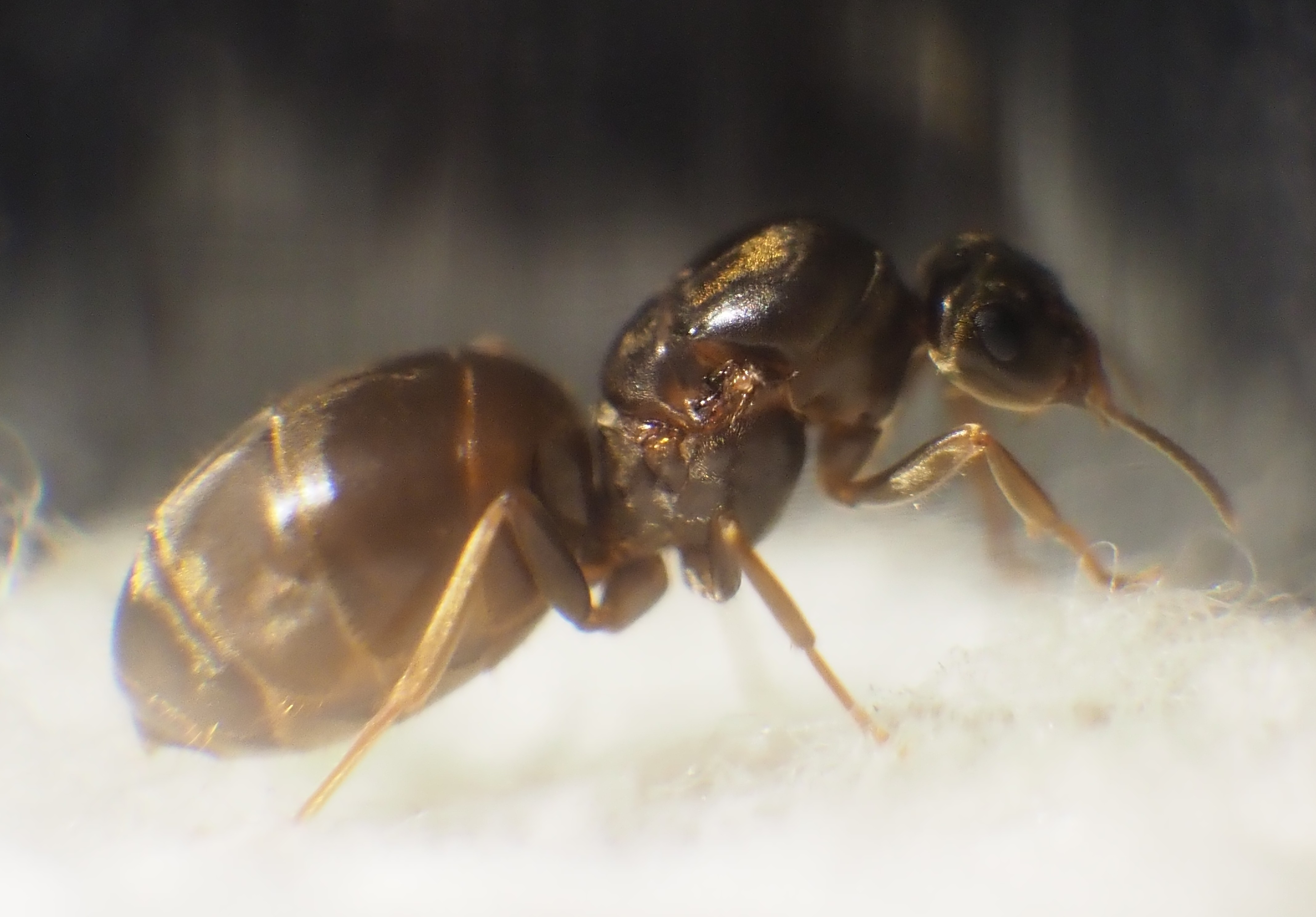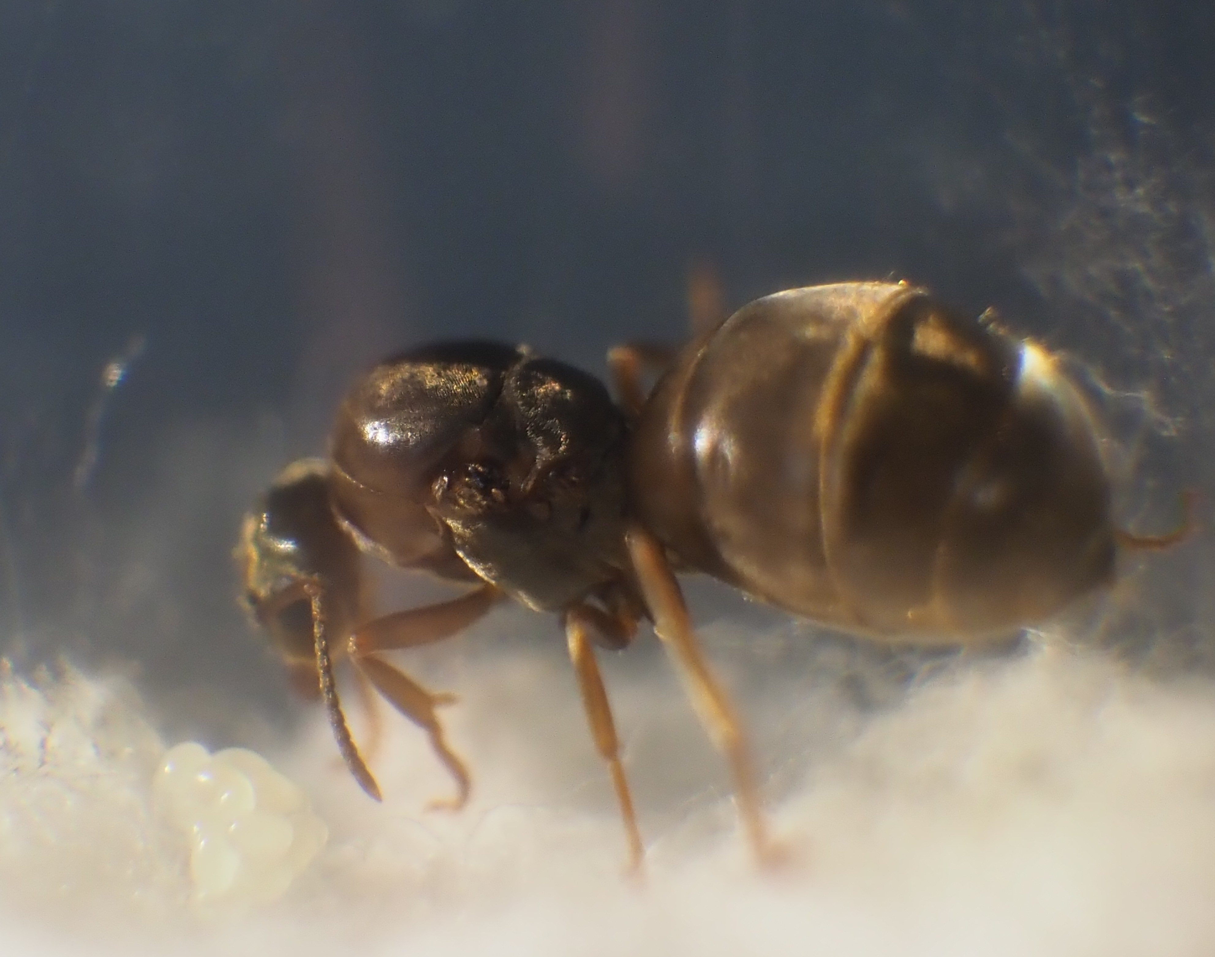 Questa è la mia Lasius flavus (almeno secondo la mia ricerca). Si può vedere il suo primo gruppetto di uova vicino alla testa, illuminata dalla luce si vede un riflesso oro, anche la tua è così?