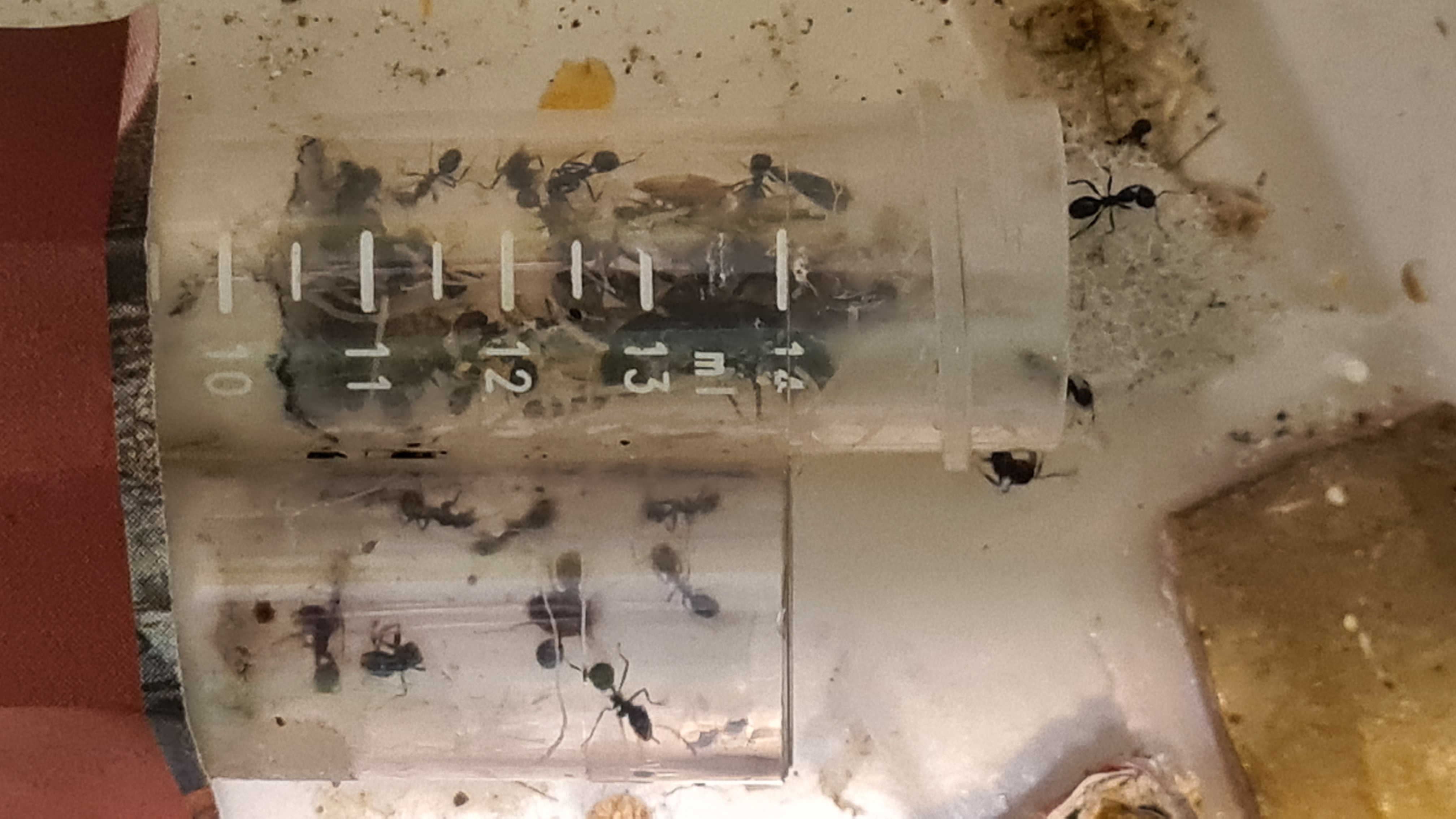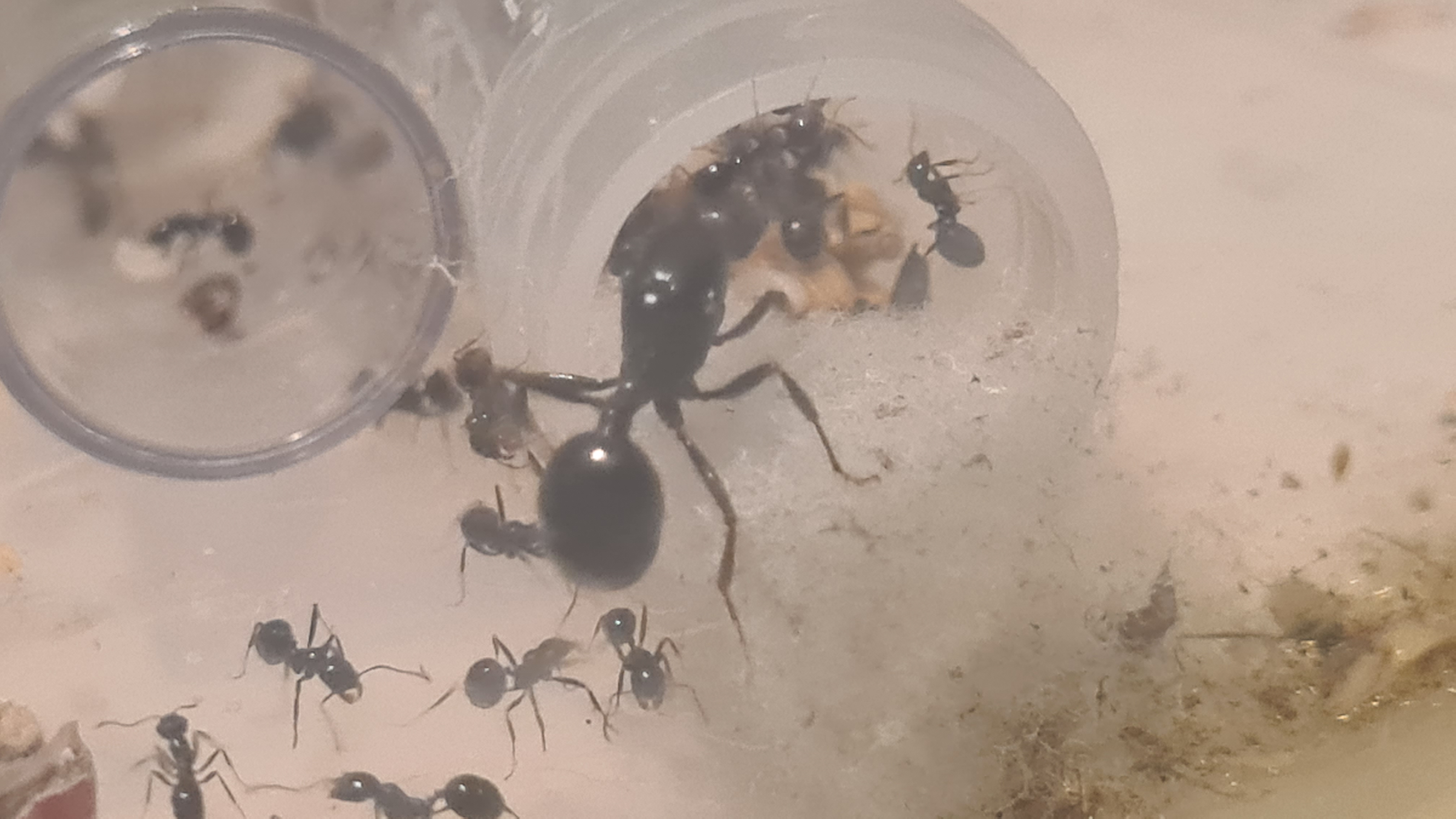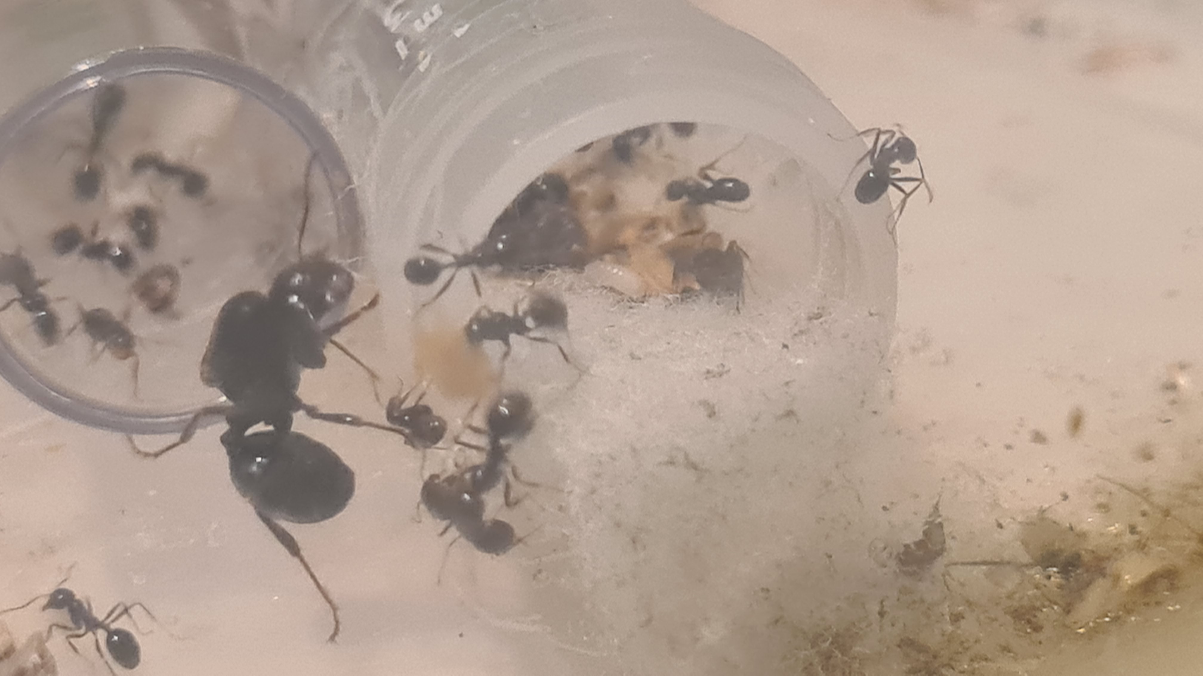 Per quanto riguarda la Lasius, ha deposto un decina di uova, ma non mi sembra di vedere pupe.