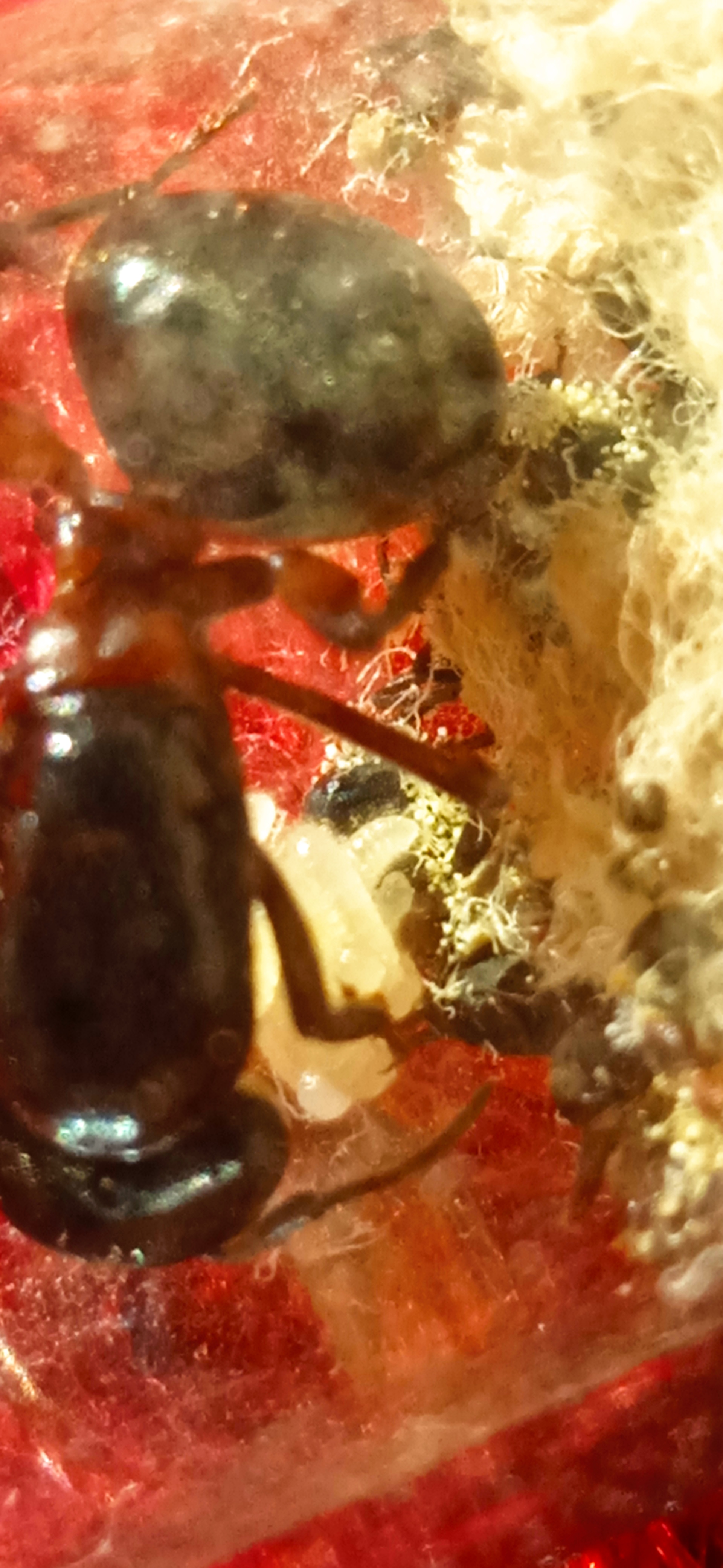 Ciao a tutti! Controllando la mia provetta di C. herculaneus che mi è arrivata oggi ho notato una formichina morta con dei funghetti sul corpo. Possibile che sia Cordyceps? Non sono stato io a ordinare le colonie ma me le hanno ordinate per il compleanno, dato che sapevano le mie specie preferite.