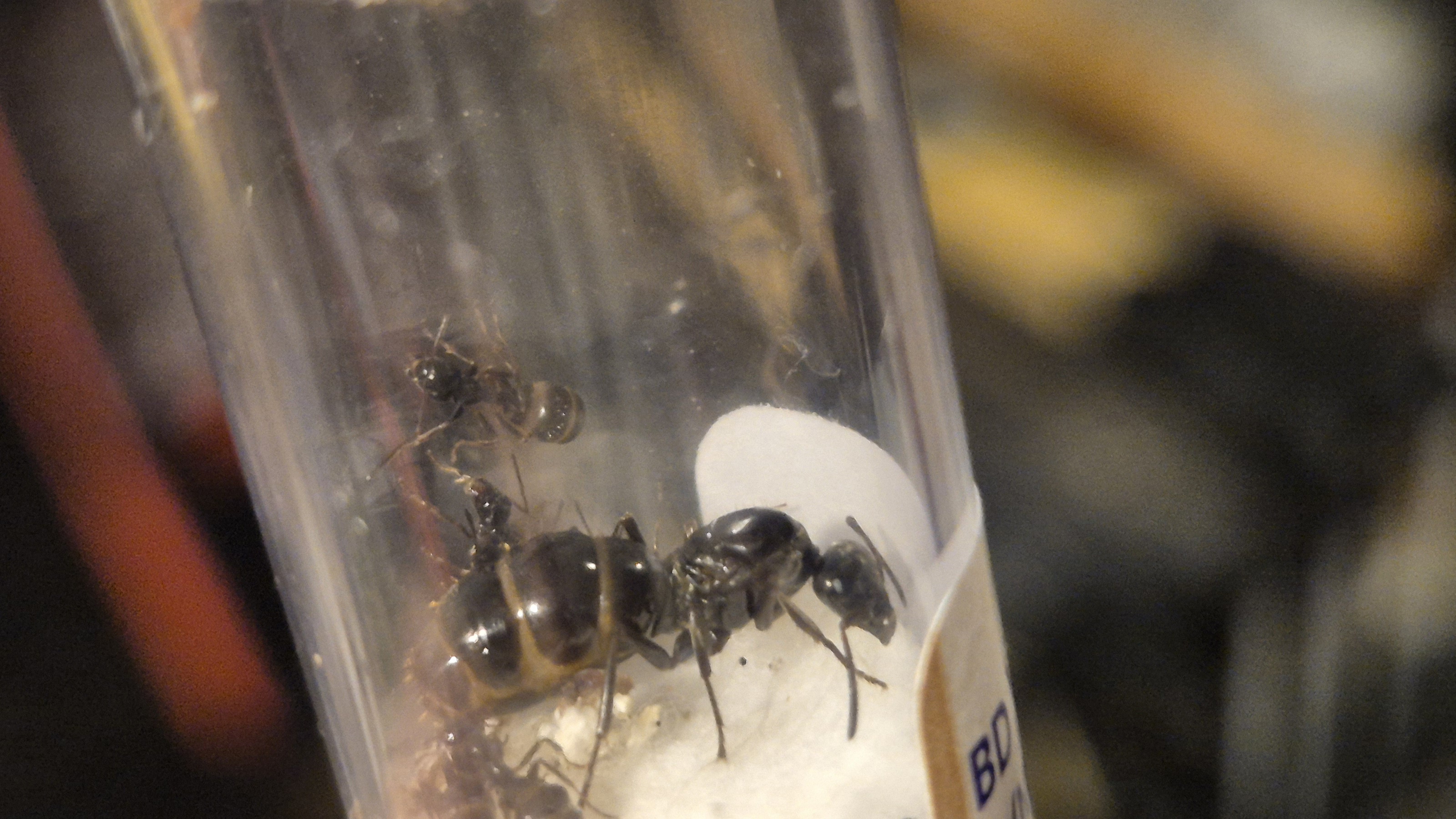 Premesso che sono timidissime, non escono mai dalla provetta e quando lo fanno sono talmente rapide che è impossibile fotografarle, la foto allegata è il massimo che sono riuscito ad ottenere. La regina si intravede appena, mi scocciava disturbarla, si agita tantissimo, così ho evitato di ribaltare la provetta, mentre l'operaia è abbastanza visibile, mi sembra di vedere una striscia grigia sul gastro e quindi avevo pensato a C. vagus, che ve ne pare?
