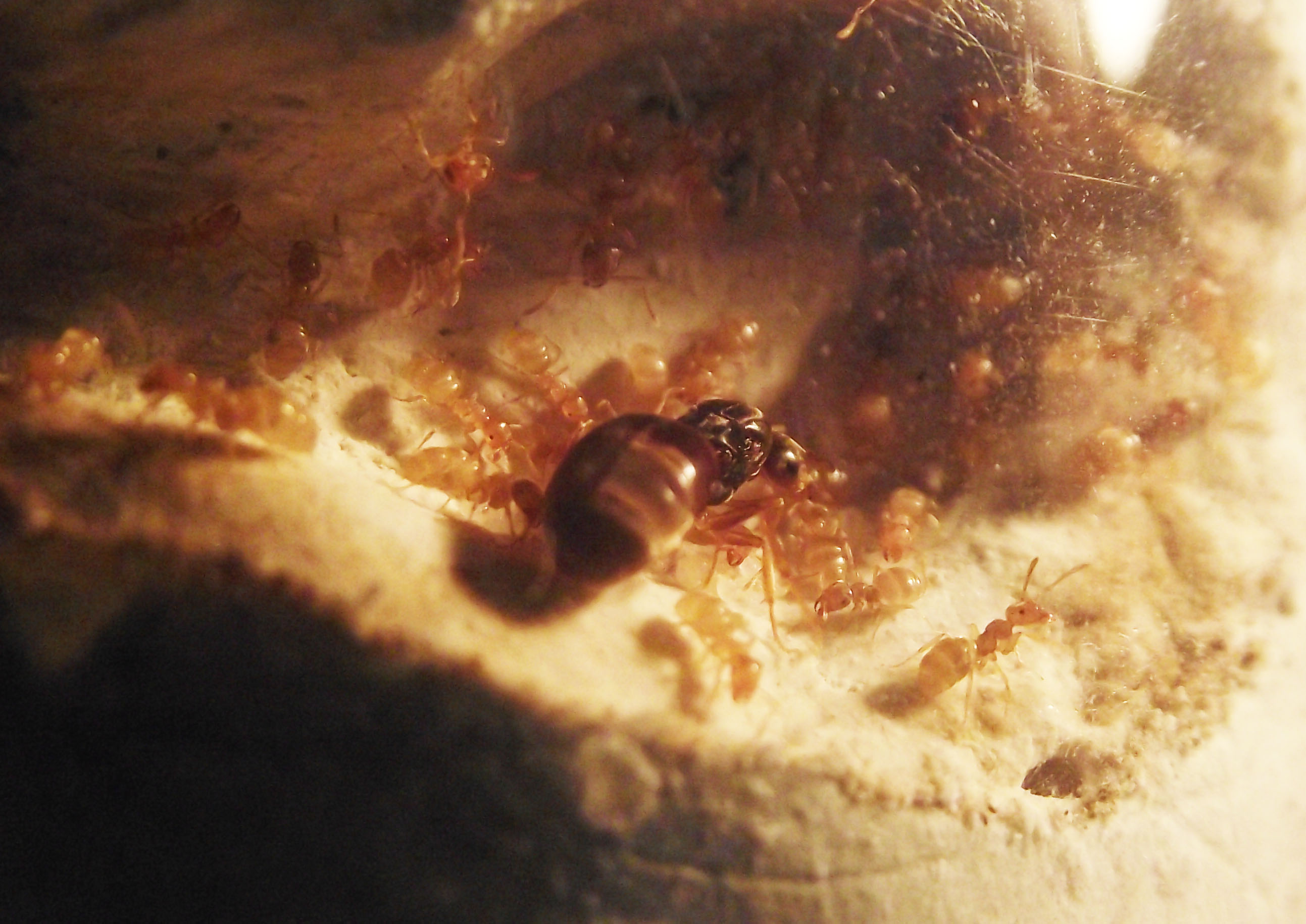La regina ha deposto una cinquantina di uova, questo perche' da quando sono nel piccolo formicaio riesco a nutrirle piu' facilmente e abbondantemente, prendono un insetto ogni giorno se piccolo ogni tre se piu' grande, ora il formicaio e' formato solo da due stanze, se queste uova si sviluppano raddoppiera' la popolazione e staranno belle strette per l'inverno e quando riinizieranno le deposizioni dovro' gia' in primavera ingrandire il piccolo formicaio! Ieri vedevo molto fermento all'ingresso del formicaio e tutto ad un tratto 15 operaie sono uscite in arena per rientrare pochi minuti dopo, chissa cosa le ha allarmate!