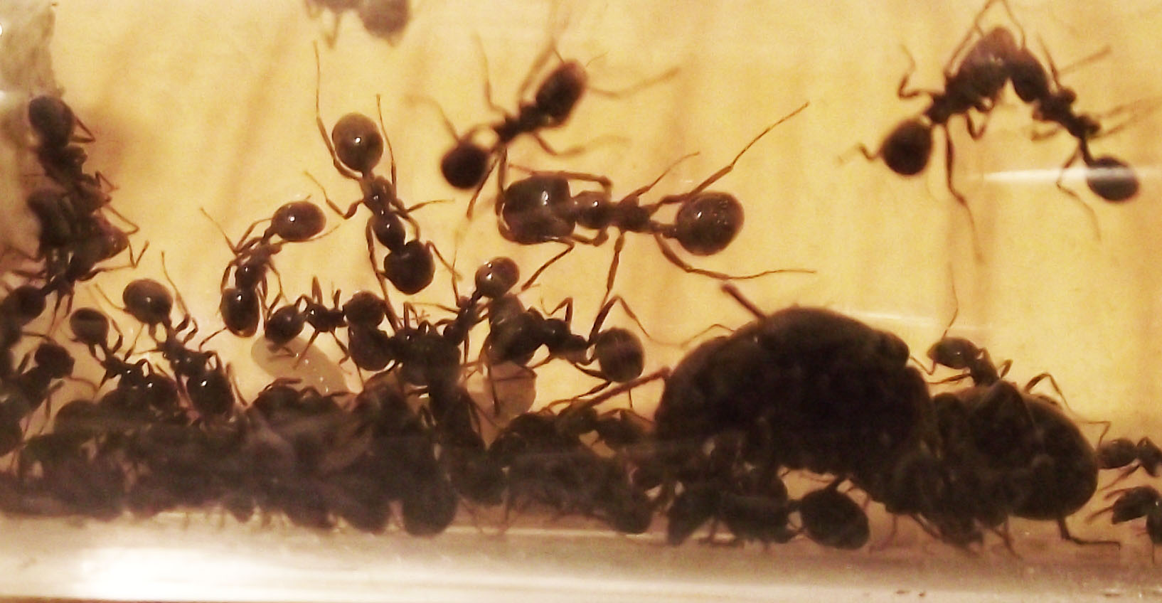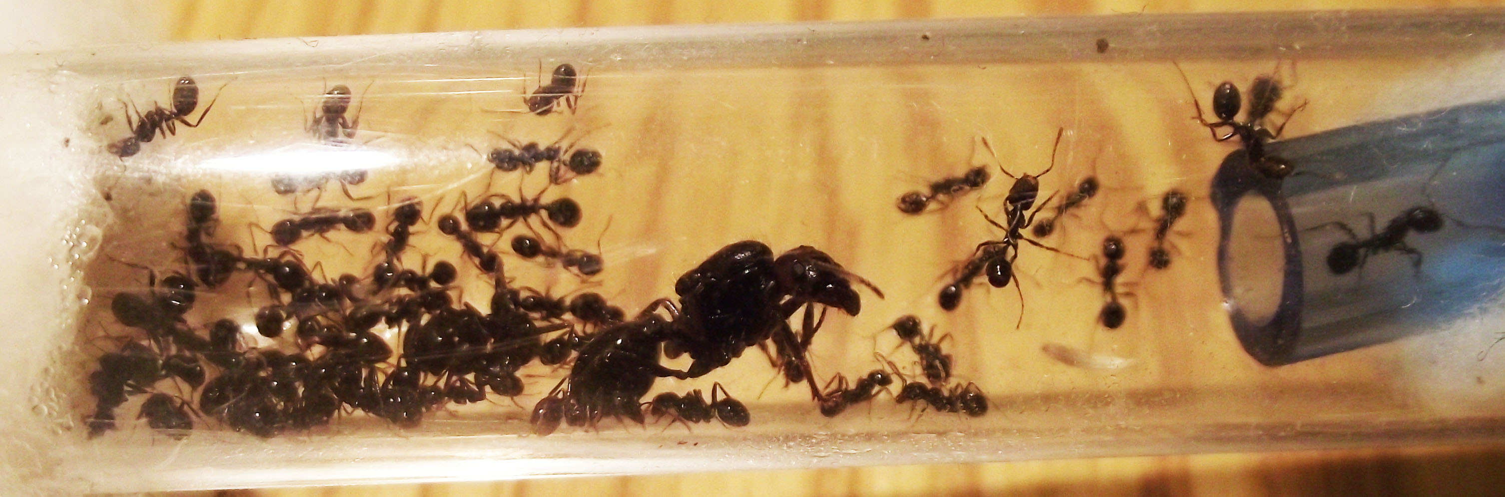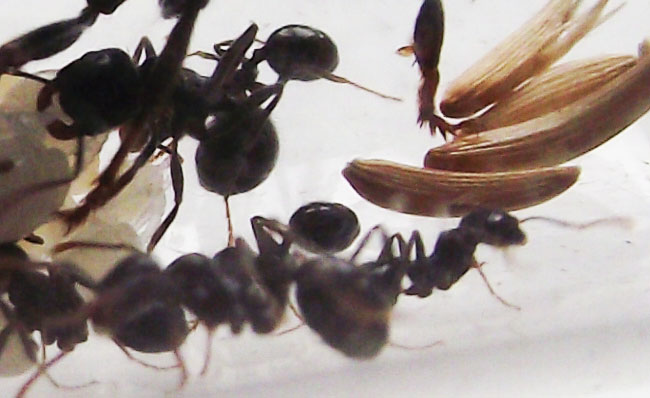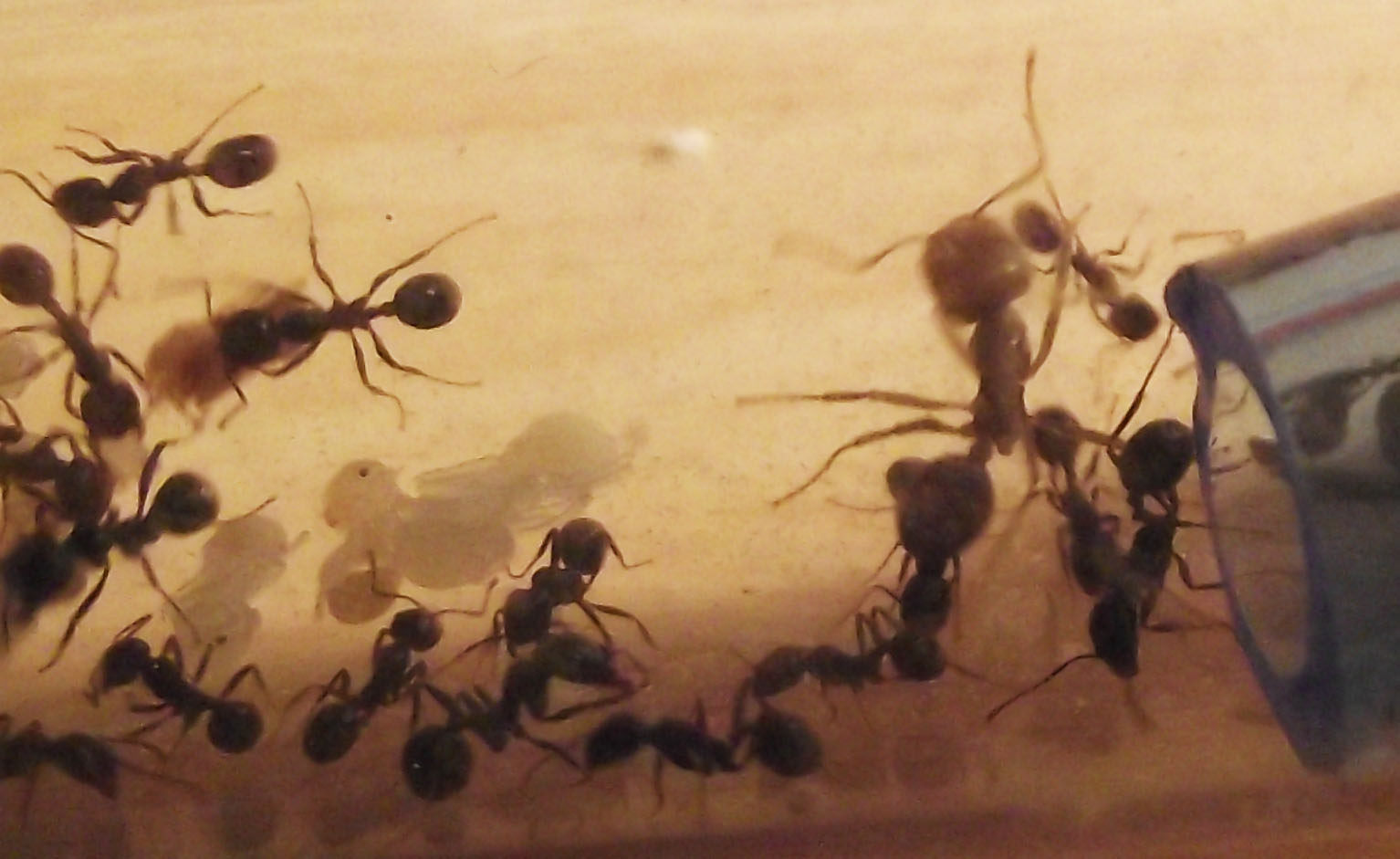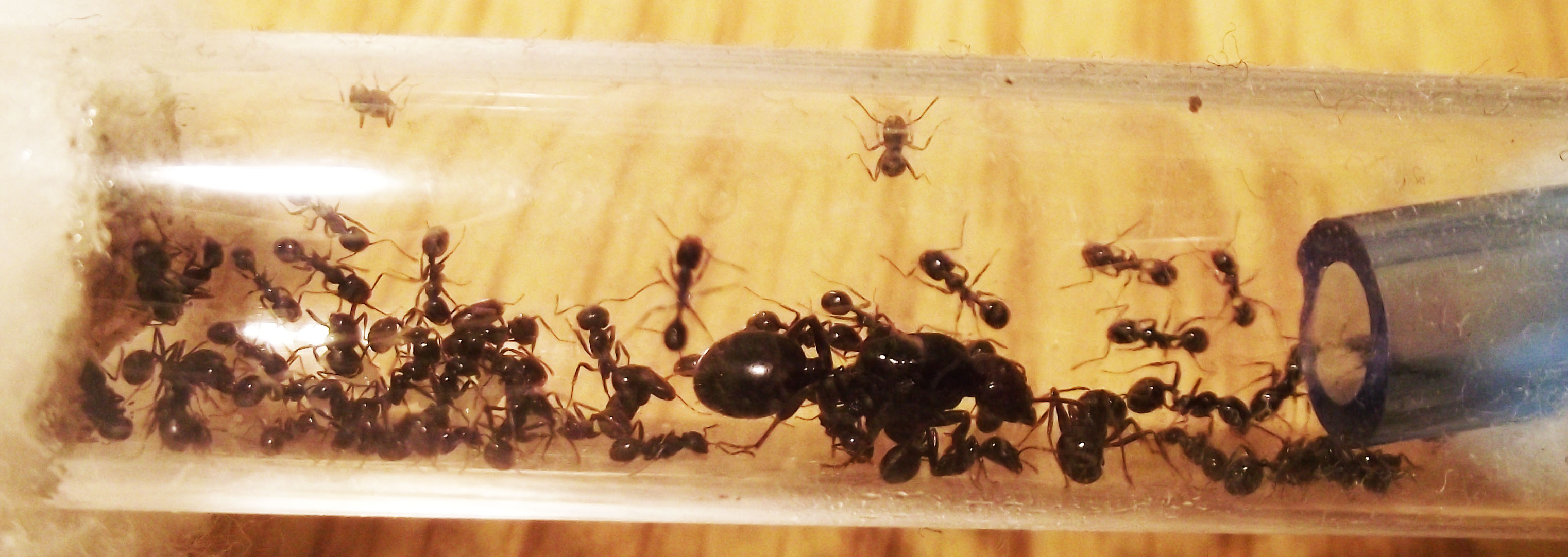 La colonia continua a crescere e inizia ad avere più necessità di proteine, fornisco loro ogni 2 giorni insetti più grandi e loro li smontano li portano in provetta e poi accumulano tutto in un'angolo dell'arena dove mettono gli scarti, sono sempre più numerose le operaie minor con la testa più grande delle altre prime nate ma non noto nessuna media, vorrei capire quale fattore le porta a far nascere delle medie, un maggior numero di operaie, più proteine a disposizione, molti semi grandi, non saprei, comunque ora superano le 30 operaie e tutto il giorno 5 o 6 sono in arena, la sera tutte rientrano nella provetta.
