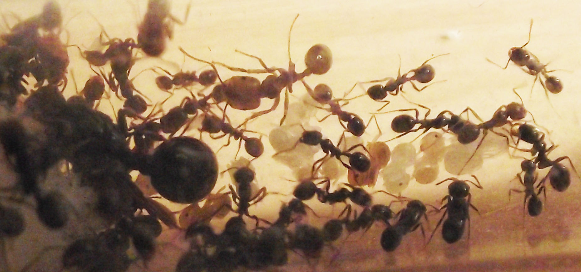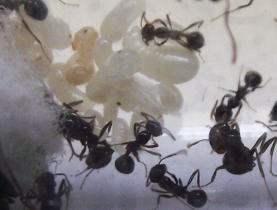 La colonia ha subito delle perdite non troppo grandi ma più del previsto, saranno morte una decina se non più, compresa l'unica operaia media, forse pensando non mangiassero ho dato troppi pochi semi (pensando anche al viaggio...nei movimenti i semi potevano essere pericolosi) e non sono riuscite a sopravvivere. Il resto della colonia sta bene e oggi la regina ha deposto, ho la certezza che sia oggi perchè proprio l'ho vista in diretta mentre raccoglieva un uovo lei stessa dall'addome. Ho fornito loro vari semi e mezza camola che non è stata considerata troppo.
