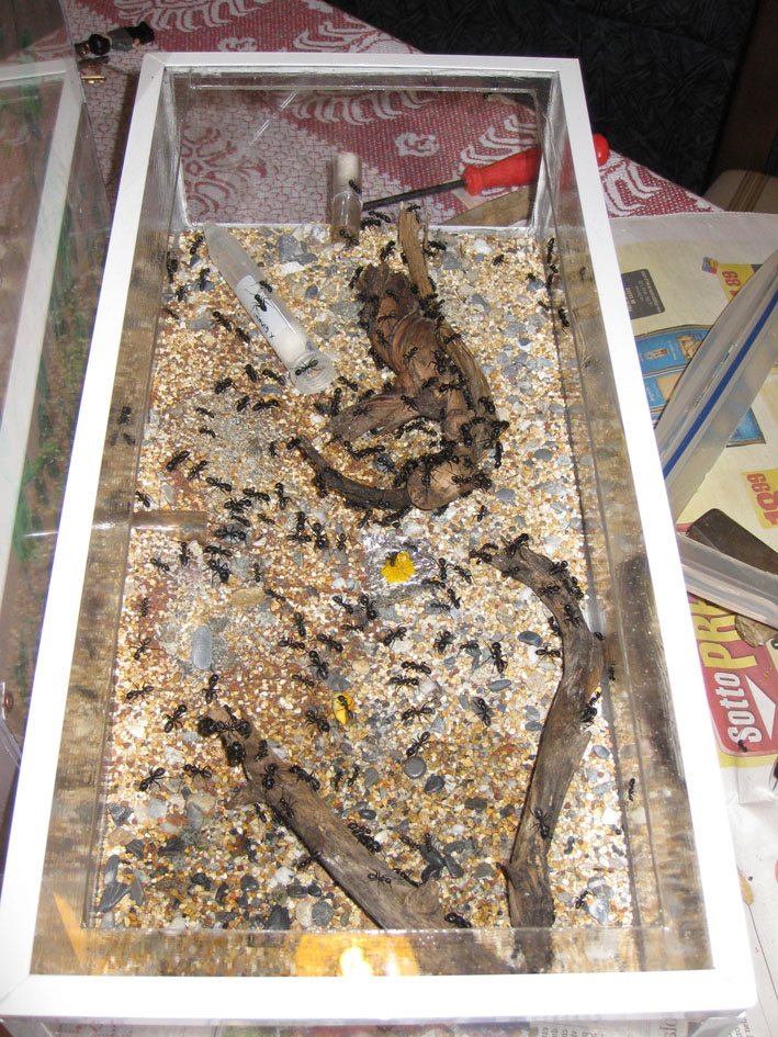 In pochi giorni, è iniziato un traffico di formiche attraverso il lungo tubo di collegamento (un metro o poco più) e le formiche hanno iniziato ad alimentarsi, con forte preferenza per il cibo animale; hanno infatti "spazzato” una decina di grilli medi in poco tempo.
