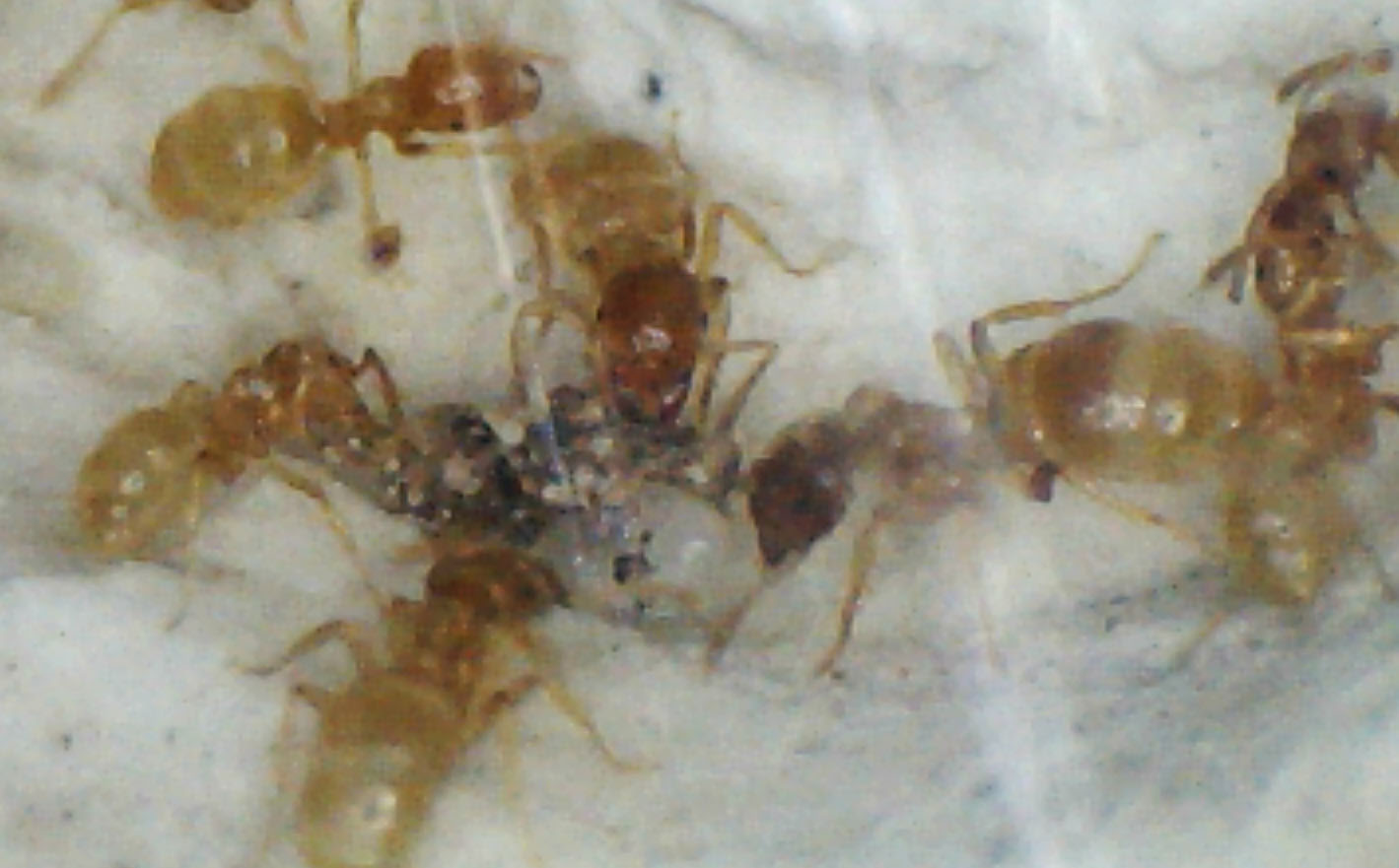 Oggi ho notato per la prima volta in questa colonia un nuovo comportamento, le operaie hanno ricoperto una larva di detriti, per aiutarla a costruirsi il bozzolo.