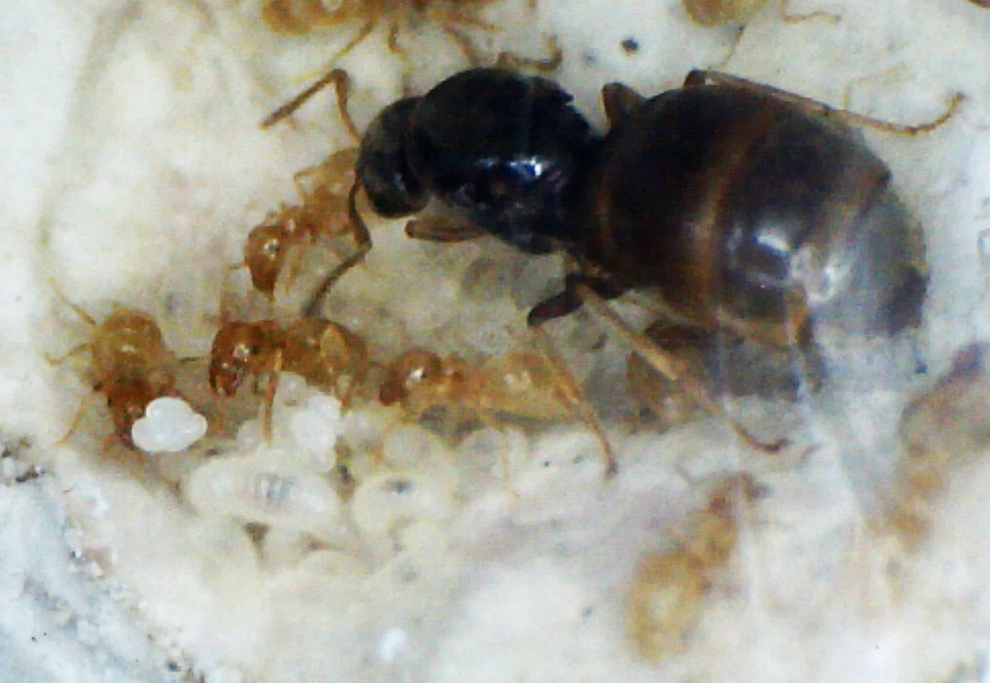 Hanno lasciato questa larva sola, tutte le altre larve sono insieme sotto la regina, nell'altra camera del formicaio, vederle insieme mi impressiona, mi immagino quando tutte quelle larve saranno operaie...raddoppierà la popolazione! Tuttavia non accettano proteine, anzi è davvero difficile vederle fuori, dopotutto sono una specie ipogea non abituata a bottinare troppo in superficie.