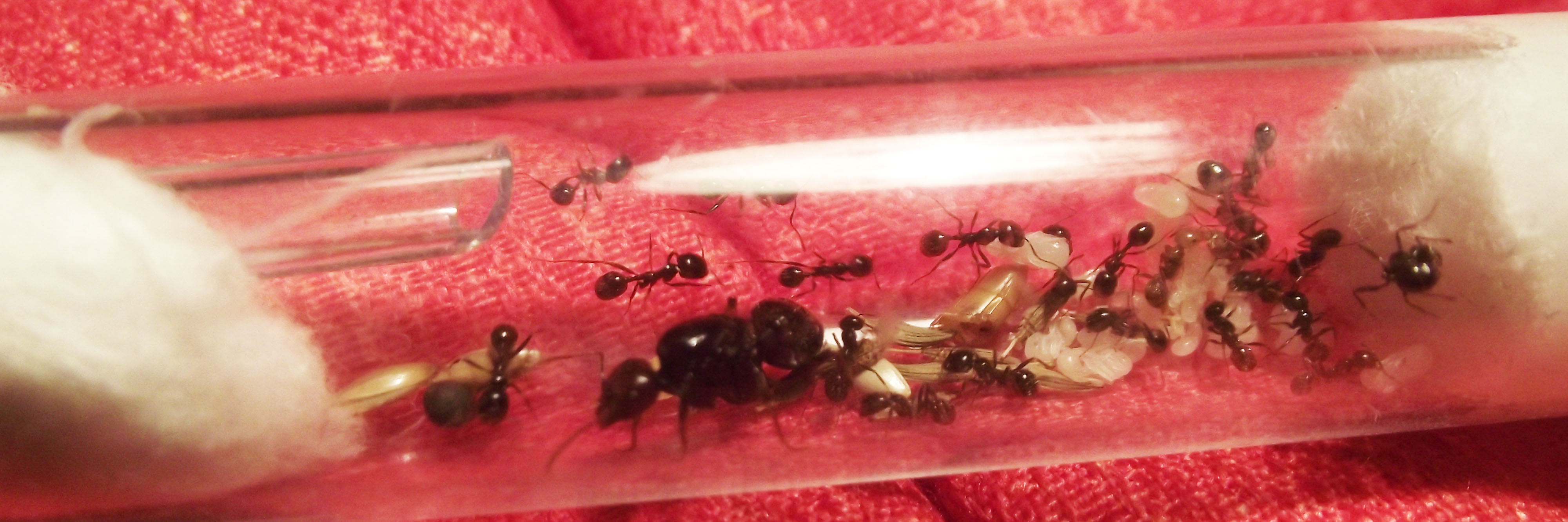 Cambio di provetta, l'altra aveva quasi finito l'acqua e la visibilità era pessima, sono bastati pochi minuti con le due provette collegate una al buio e una alla luce e regina e covata sono state spostate nella nuova, a quel punto ho collegato la nuova provetta all'arena e fatto cadere le operaie rimaste nella vecchia provetta in arena. Adesso che la visibilità è aumentata sono riuscito a contarle, purtroppo come previsto sono diminuite tanto, rimangono circa 25 operaie! L'inverno non è stato clemente, si vedono operaie di varie misure, una un pò più grande ma non raggiunge le dimensioni di una media, varie larve e pupe e un bel gruppo di uova abbastanza numeroso, oggi per la prima volta hanno preso un pezzo di camola e lo hanno portato dentro la provetta.