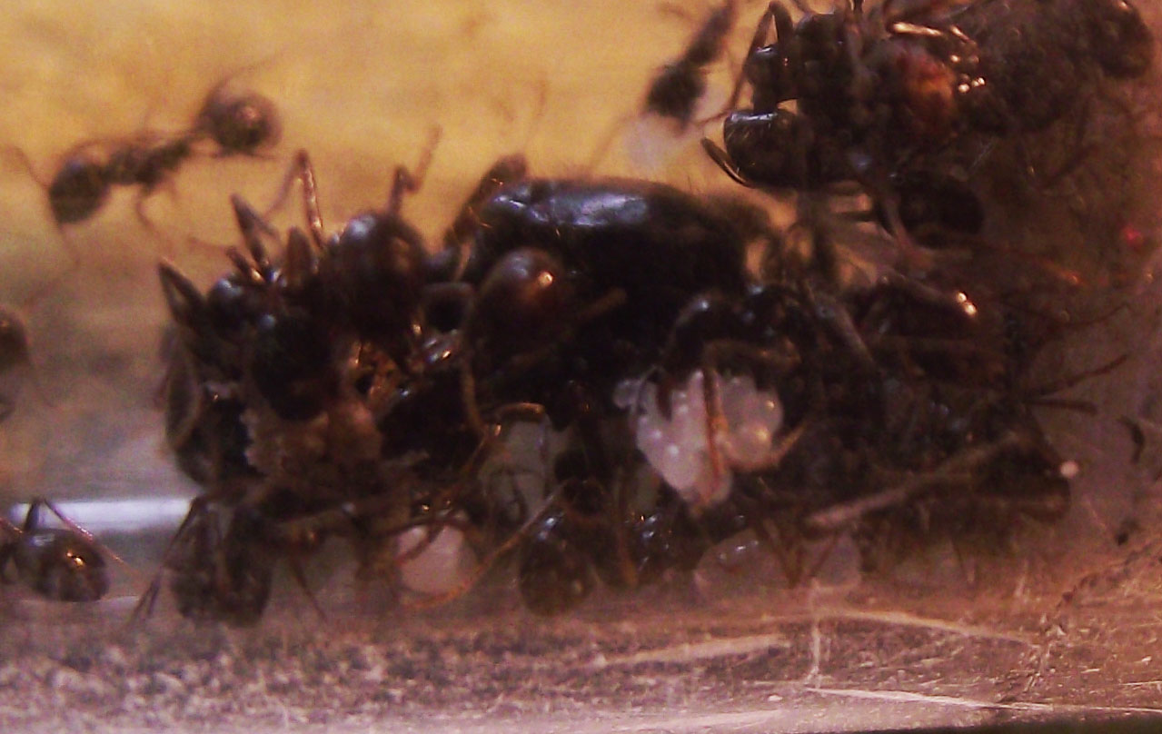 Continuano a non accettare proteine, di nessun tipo, camole meno che tutti, e in effetti non si stanno sviluppando velocemente...tutt'altro, è vero che sono aumentate di numero ma la covata non è grande, poche larve e un pacchetto di uova. Le altre colonie che ho si stanno dando da fare con molte larve e uova,queste sono più rilassate, è nata la media, da quella larva grossa di qualche mese fa, e varie minor.Spoiler: mostra