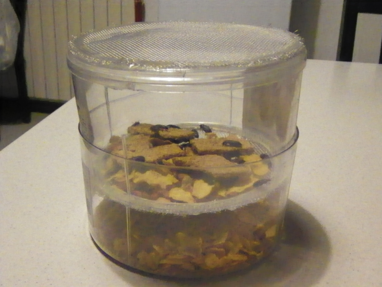 Comunque, per avere la certezza assoluta di non trovarsi MAI un adulto in giro per casa, bisogna mettere un coperchio e bucarlo con veemenza per favorire l'aerazione, che per le camole è fondamentale.