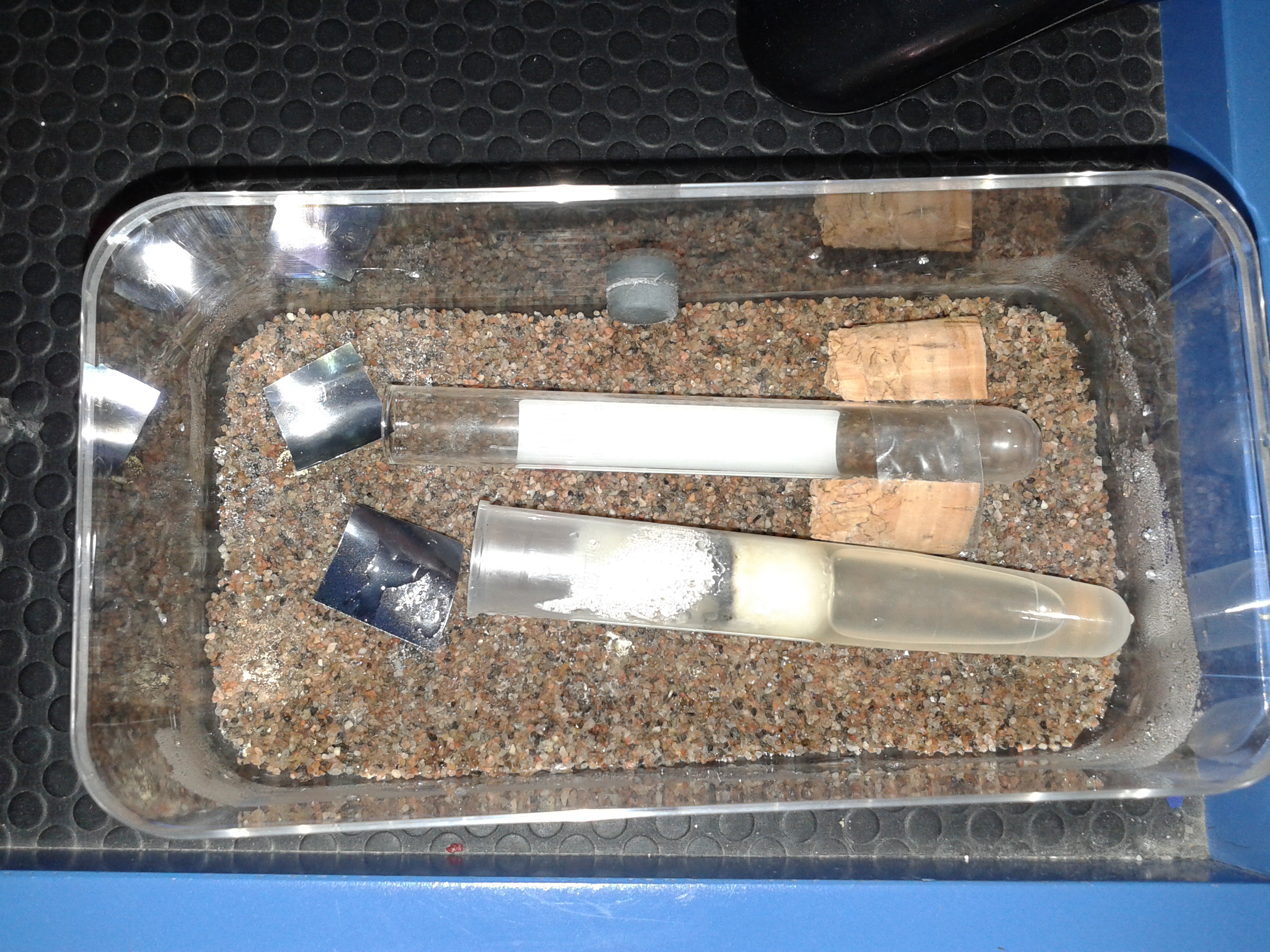 cosa mi consigli al posto della sabbietta? ho letto che la terra non va bene se no coprono il vetro e ho visto che molti usano una colata di gesso secondo voi qual'è la soluzione piu pratica? le provette non sono schermate su una c'è una etichetta e nell'altra è l'umidità che ha creato quell'effetto..