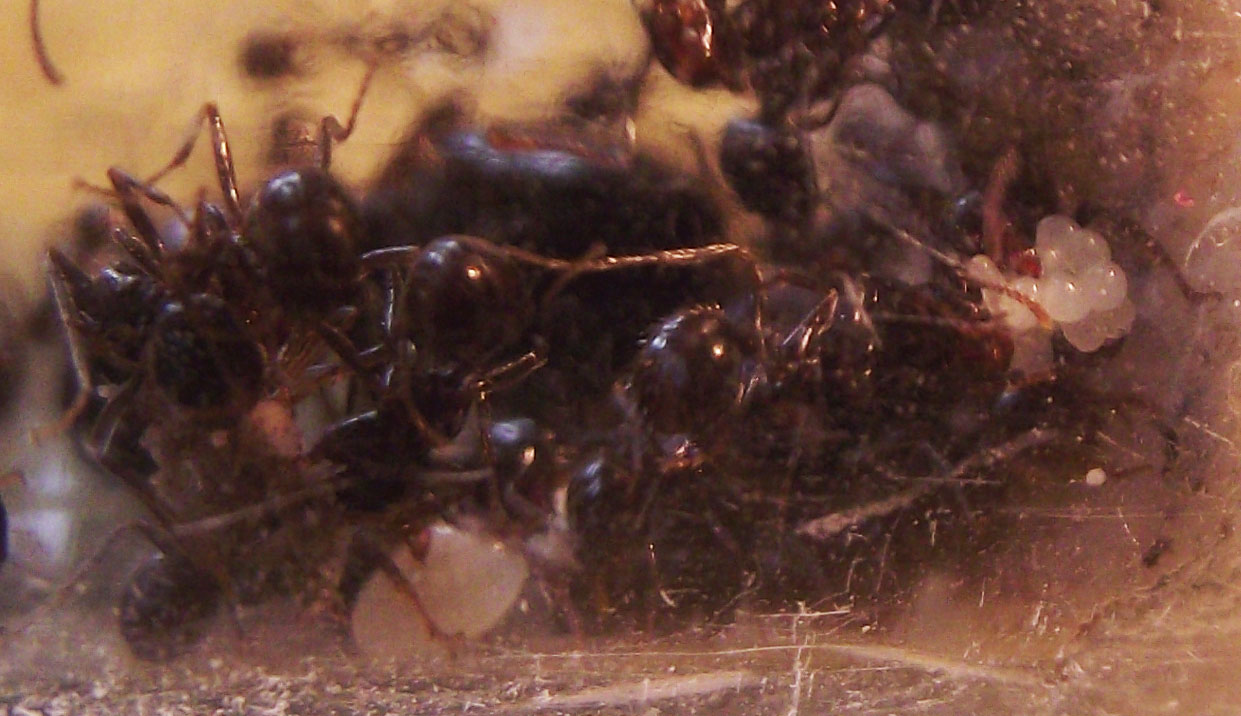 Continuano a non accettare proteine, di nessun tipo, camole meno che tutti, e in effetti non si stanno sviluppando velocemente...tutt'altro, è vero che sono aumentate di numero ma la covata non è grande, poche larve e un pacchetto di uova. Le altre colonie che ho si stanno dando da fare con molte larve e uova,queste sono più rilassate, è nata la media, da quella larva grossa di qualche mese fa, e varie minor.