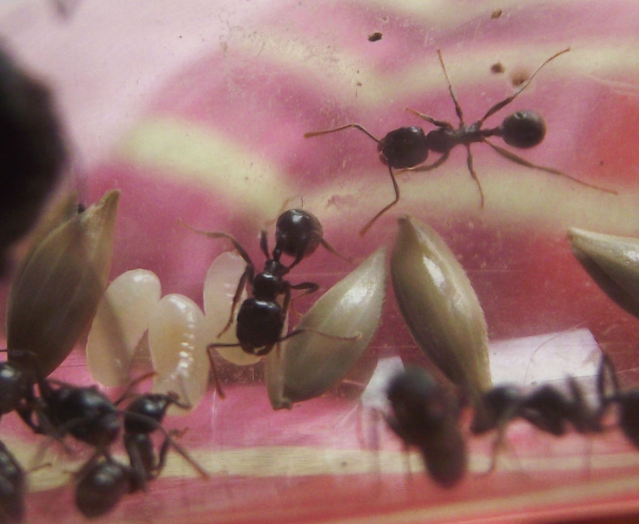 Come previsto ormai anche se all'esterno fa freddo in casa è abbastanza caldo da far risvegliare la colonia, le larve si sono impupate e mi sembra di poter dire che hanno nutrito abbastanza una larva per avere di nuovo una media nella colonia. Non accettano proteine per ora, ne camole ne pezzetti di carne, purtroppo non ci sono altri insetti per ora...Appena possibile provo con un pò di tuorlo d'uovo vedo se lo gradiscono. Non essendoci medie o major non riescono ad aprire i semi, la regina ormai non si occupa più di questo come faceva l'anno scorso, ho notato che non avevano "pane" e i semi rimanevano intatti e sempre dello stesso numero, ho provato a fornire un seme schiacciato, è stato subito portato dentro e lavorato, fino alla nascita della prossima operaia con un capo abbastanza grosso penso che dovrò aiutarle un poco, nei mix di semi non c'è una grande varietà in natura troverebbero sicuramente piccoli semi adatti a loro.